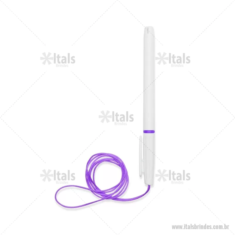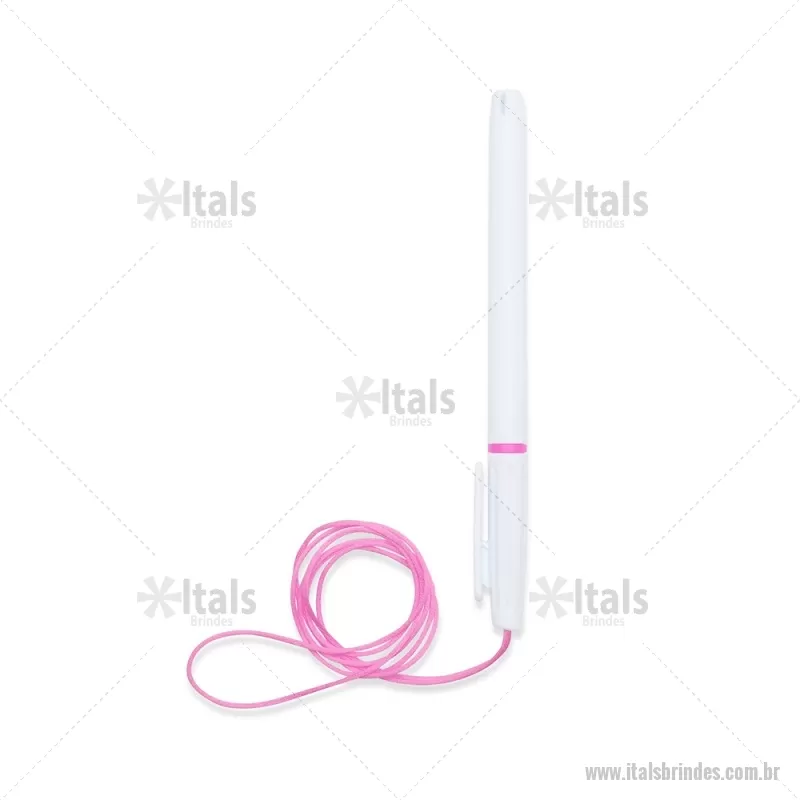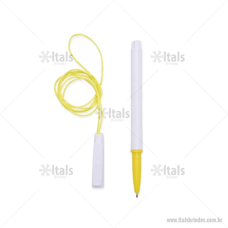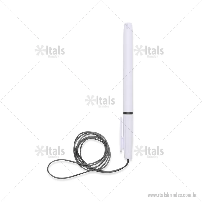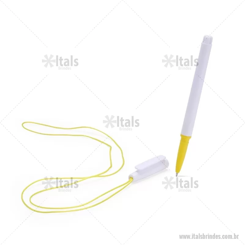 Caneta plástica com carga esferográfica azul 1,0 mm, acompanhada de cordão em nylon de 42 cm fixado na tampa. Leve e prática para uso diário. - - ITACPL208