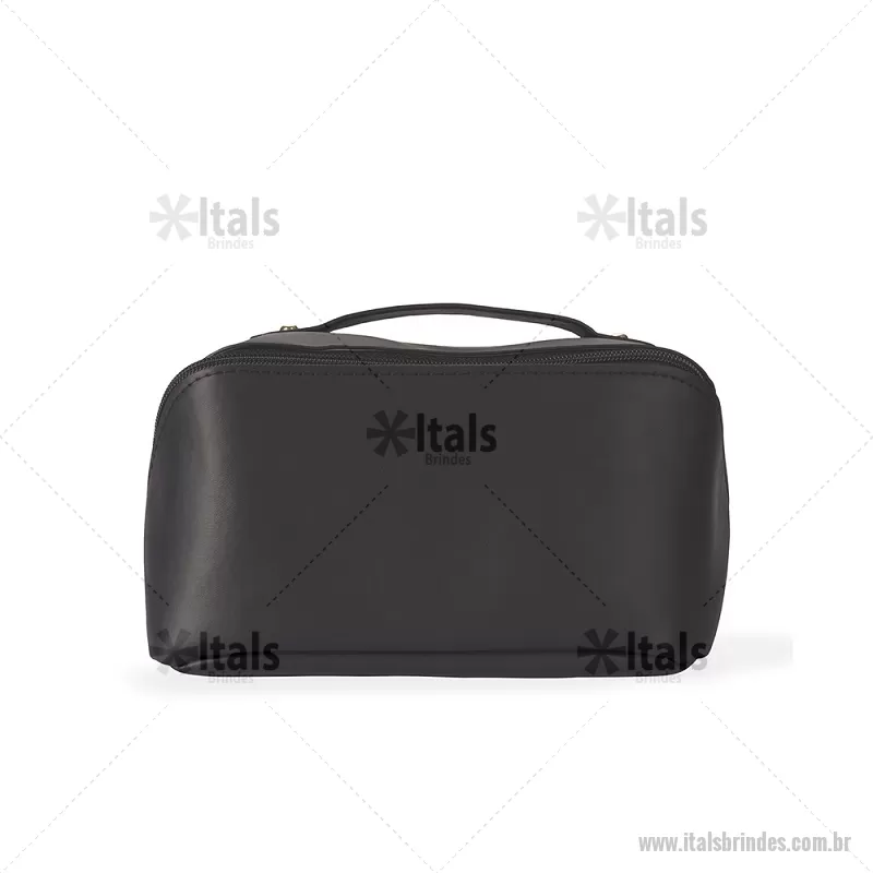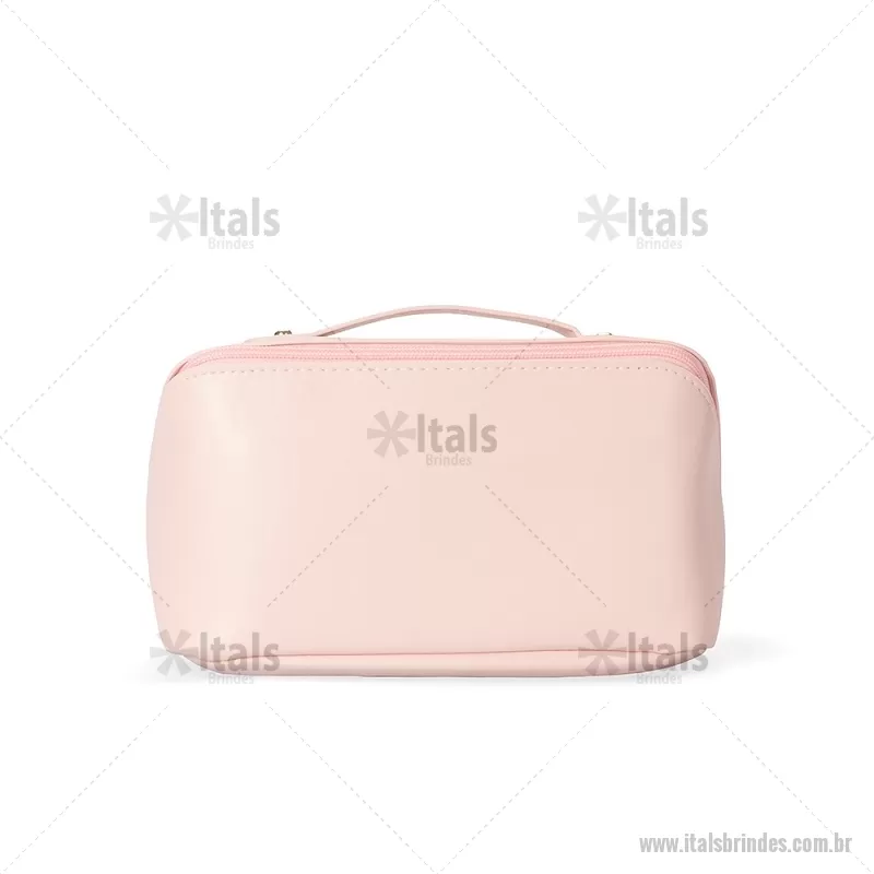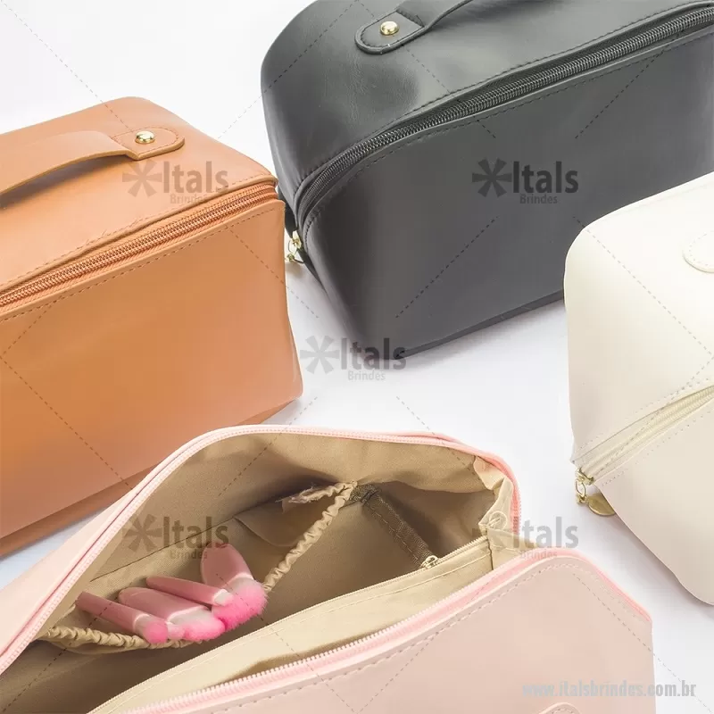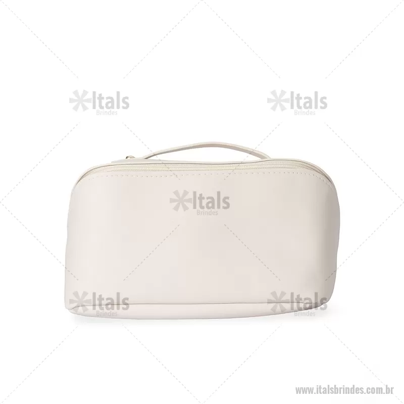 Nécessaire em PU impermeável com abertura em 180 graus, estilo concha, oferecendo fácil visualização dos itens. Possui compartimento interno amplo com dois bolsos laterais e um bolso central com zíper, além de alça para transporte. Ideal para organizar acessórios e produtos pessoais. - - ITANC146