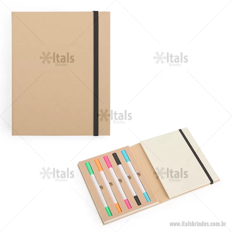 Bloco de anotações com capa dura em kraft e fechamento por elástico. Possui aproximadamente 80 folhas de tonalidade marfim sem pautas e cinco canetas coloridas de ponta dupla: uma fina e outra tipo pincel. Largura : 14,3 cm x Espessura : 2,3 cm x Comprimento : 18,1 cm Tamanho total aproximado (CxL): Caneta: 16,1 cm x 1 cm Peso aproximado (g): 247 - - ITABLC280