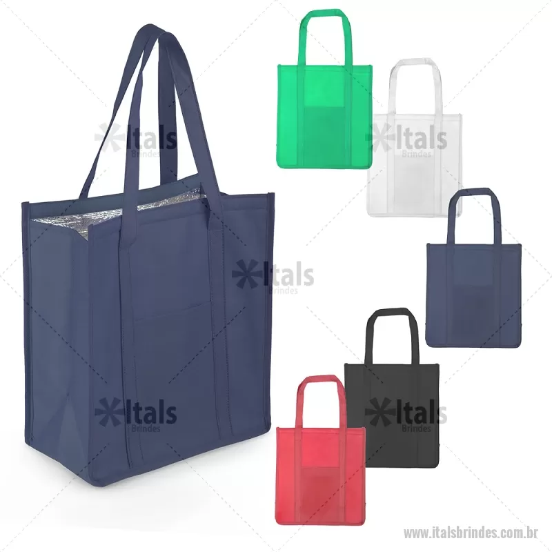 Sacola térmica confeccionada em TNT com gramatura de 80 g/m². Possui interior costurado com revestimento em algodão e folha de alumínio de 2 mm, auxiliando na conservação da temperatura de alimentos e bebidas. Conta com bolso frontal, fechamento em velcro e alça de 50 cm de ponta a ponta, proporcionando praticidade no transporte. - - ITABT118