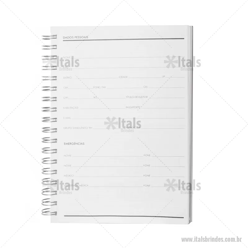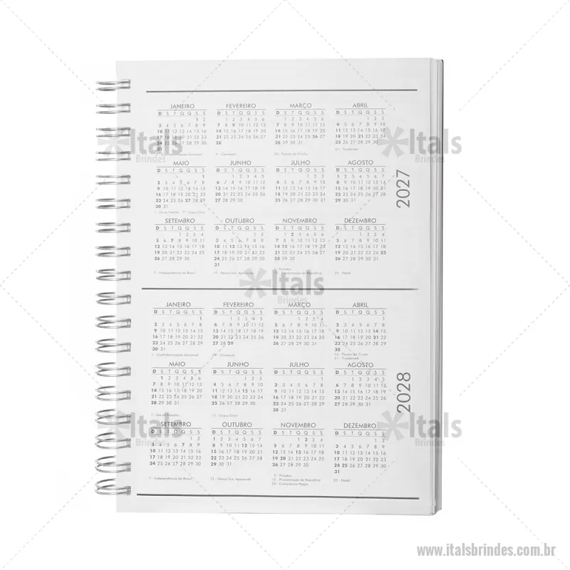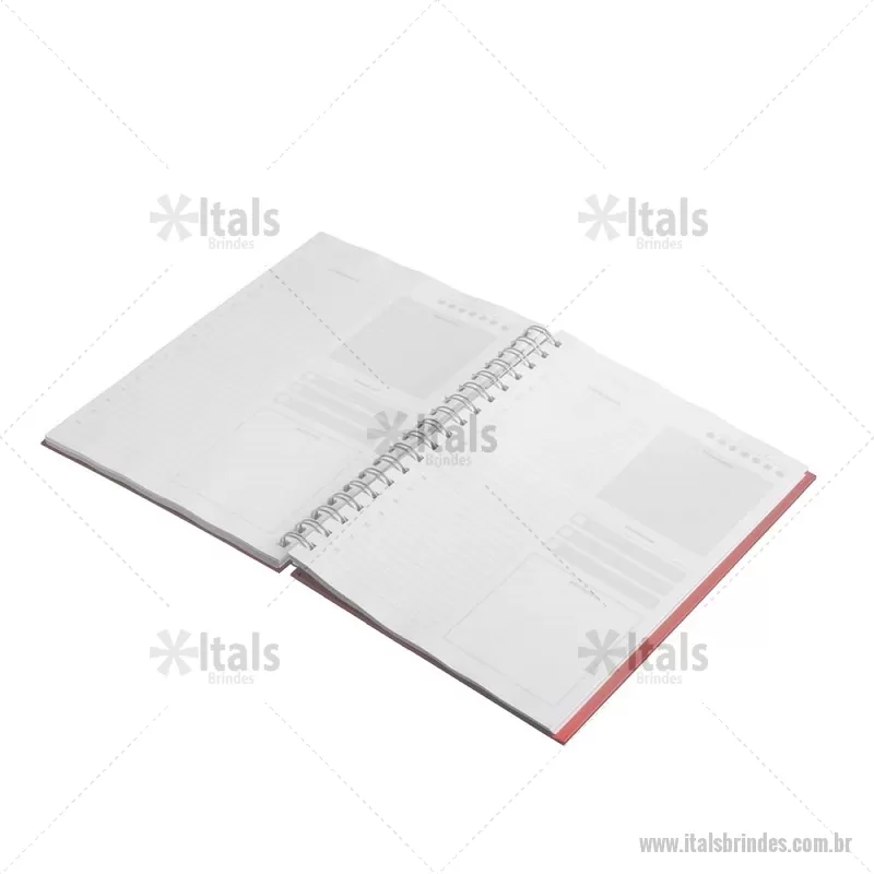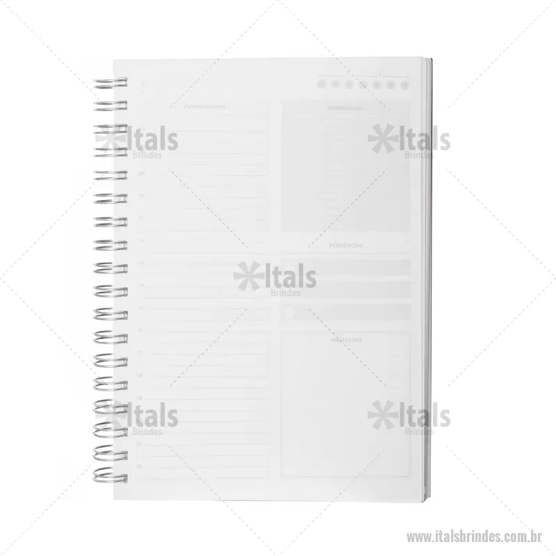 Caderno planner em espiral com capa rígida em Percalux de 2 mm. Possui 90 folhas brancas de 95 g/m² com layout de planner, ideais para organização e controle da rotina. Inclui páginas de dados pessoais, calendários de 2025 a 2028 e espaços para anotações mensais. - - ITACAD034