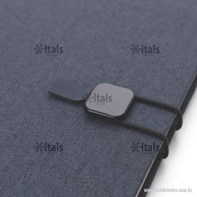 Caderno de anotações com elástico, capa dura em tecido poliéster, miolo 80 folhas pautadas na cor bege.