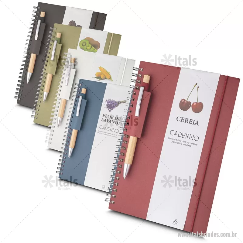 Caderno de anotações 21x15cm, capa em papel 100% reciclado com elástico, contendo: Miolo de 70 folhas pautadas na cor bege; Com suporte para caneta em papel reciclável;