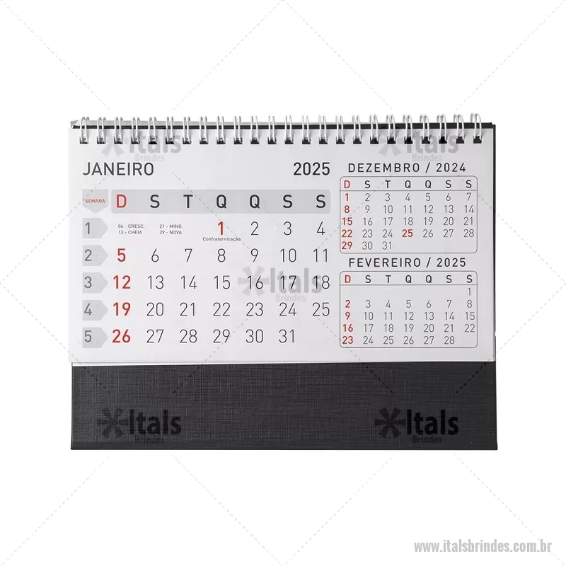 Calendário de mesa 2025 em papel couche 115g, base em percalux. Altura : 15,4 cm x Profundidade : 7,1 cm x Comprimento : 21,1 cm Peso aproximado (g): 163 - - ITACLD007