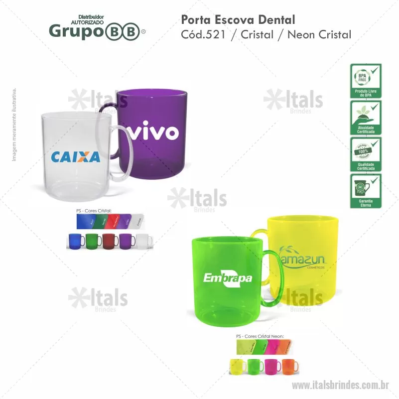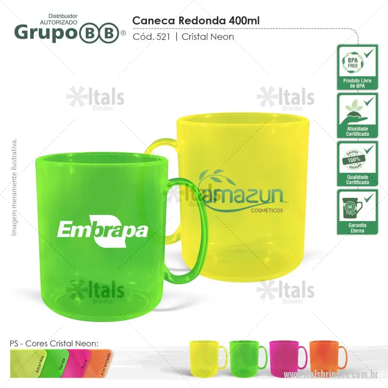 Caneca plástica translúcida, de alta resistência, atóxica e capacidade para 400 ml. Cores Disponíveis - CRISTAL: Transparente, verde, vermelho, azul, lilás / NEON CRISTAL: rosa neon, verde neon, amarelo neon, alaranjado neon. Brinde ideal para eventos corporativos e ações promocionais. Personalização 1 cor. Outras opções sob consulta. Distribuidor Autorizado Grupo BB. - - ITAZ521