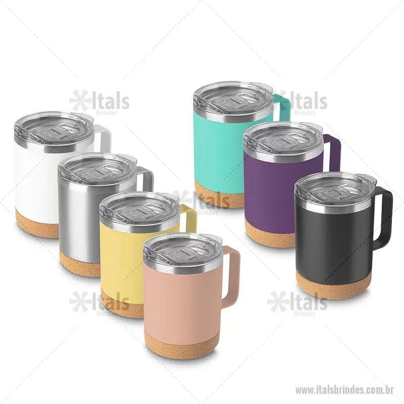 Caneca térmica em aço inox com parede dupla isolada à vácuo, tampa plástica e anel em silicone para vedação, alça lateral em inox na cor do produto, base em cortiça. Capacidade 350ml. - - ITACAN076