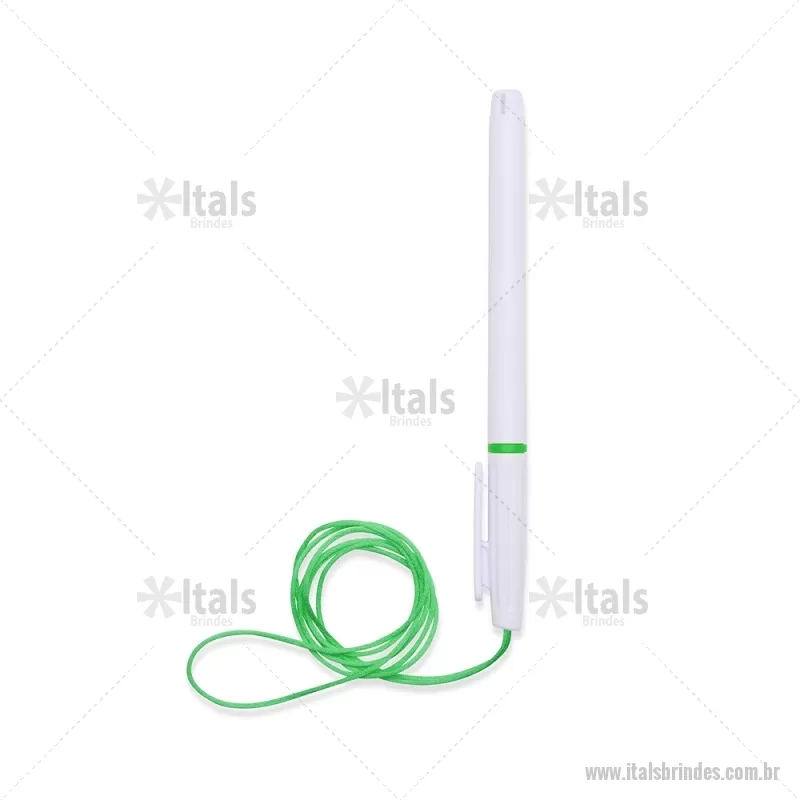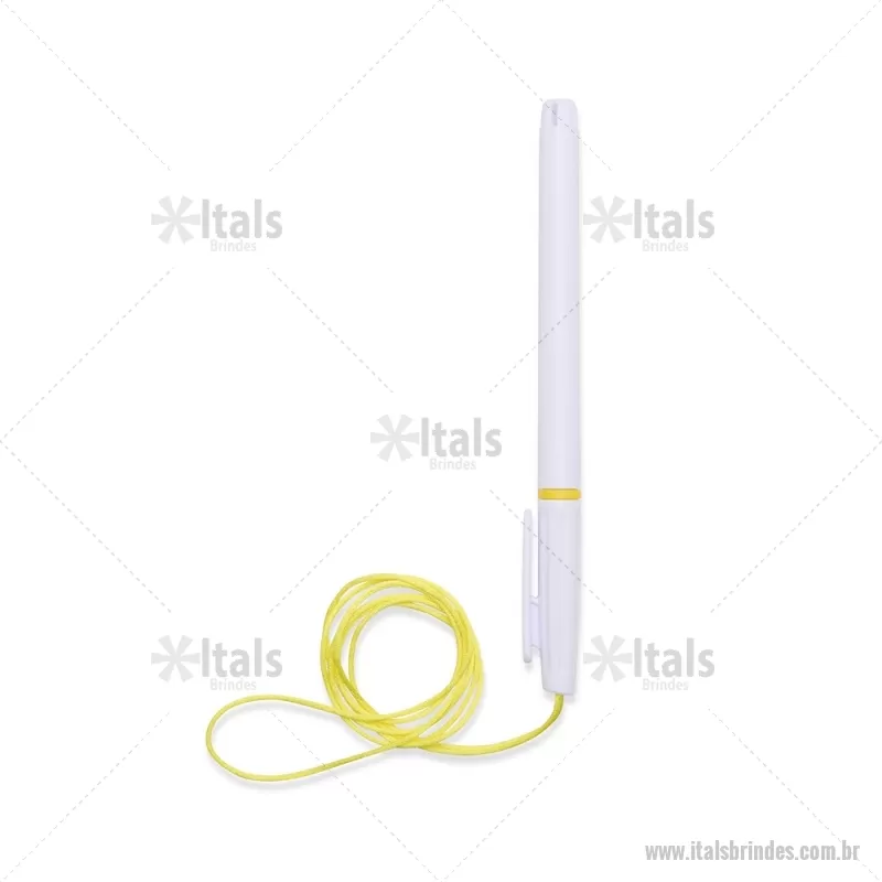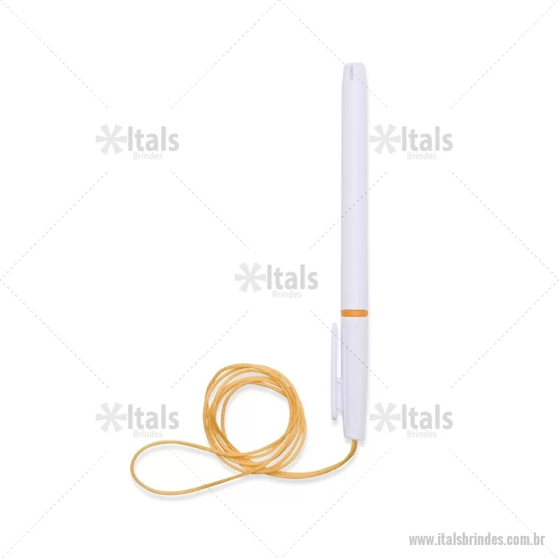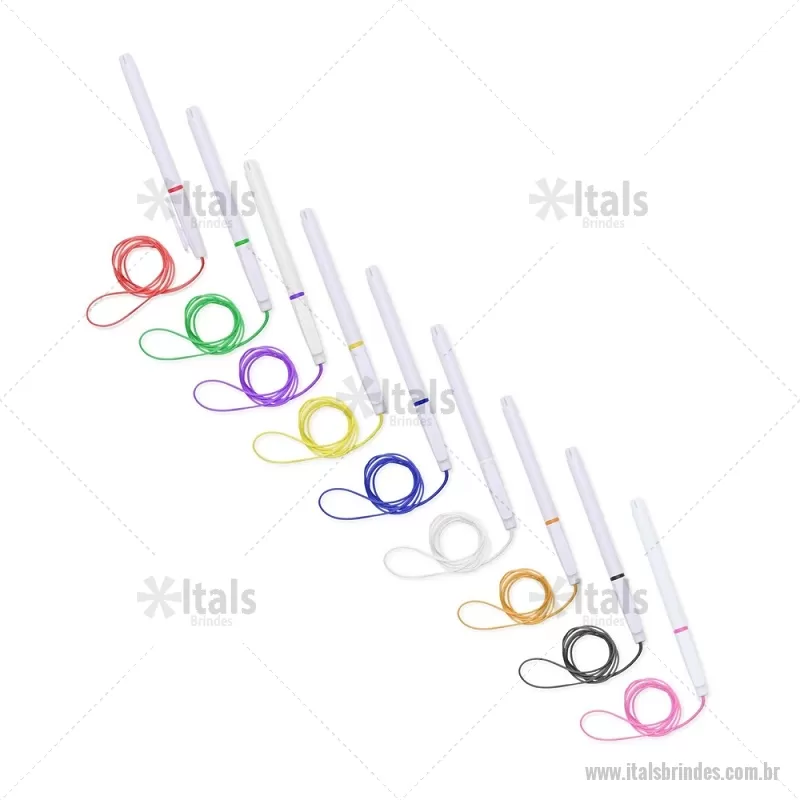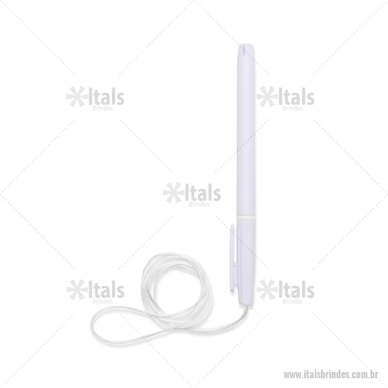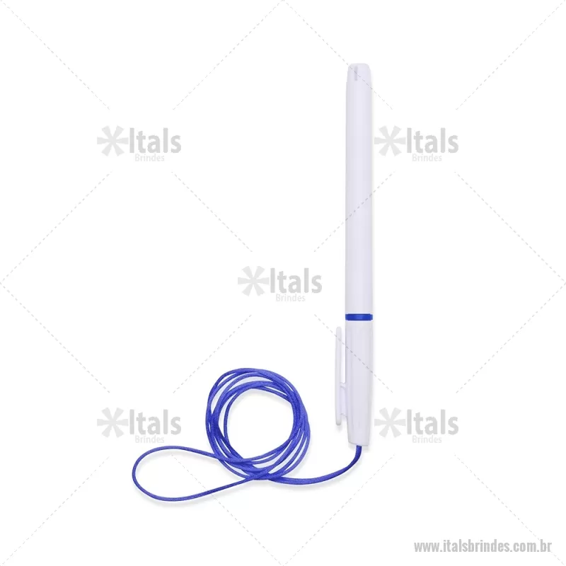 Caneta plástica com carga esferográfica azul 1,0 mm, acompanhada de cordão em nylon de 42 cm fixado na tampa. Leve e prática para uso diário. - - ITACPL208