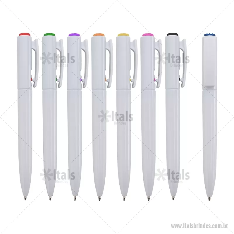 Caneta plástica branca com detalhes coloridos e anel central em relevo. Aciona por clique e para destravar basta apertar a parte inferior do clip. Medidas: 1,2 cm x 13,6 cm Peso aproximado (g): 8 - - ITACPL188