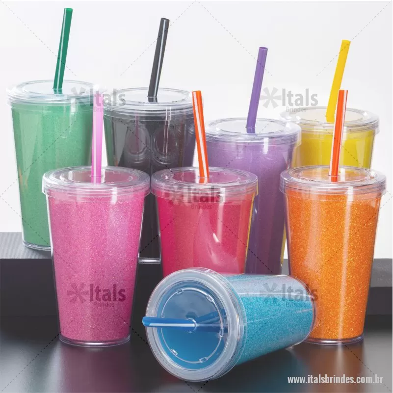 Copo acrílico parede dupla com capacidade de 540 ml. Esse copo possui personalização interna feita de EVA com glitter, tampa e canudo biodegradável. Cores: Azul, vermelho, dourado, prata, branco, preto, laranja, café, lilás, amarelo, verde claro, verde escuro, azul claro e rosa. Embalagem inclusa. Brinde corporativo ideal para divulgar, promover e fidelizar clientes e colaboradores. - - ITACPO050