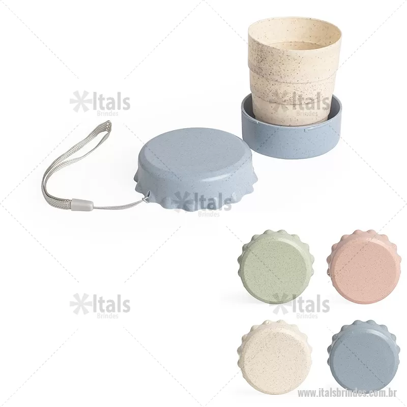 Copo retrátil Plástico em palha de trigo de 125ml. Acompanha alça de nylon.