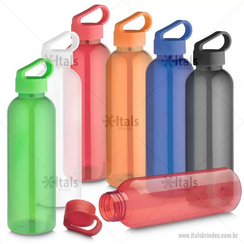 Garrafa *RPET com capacidade de até 550ml, tampa plástica com alça integrada.