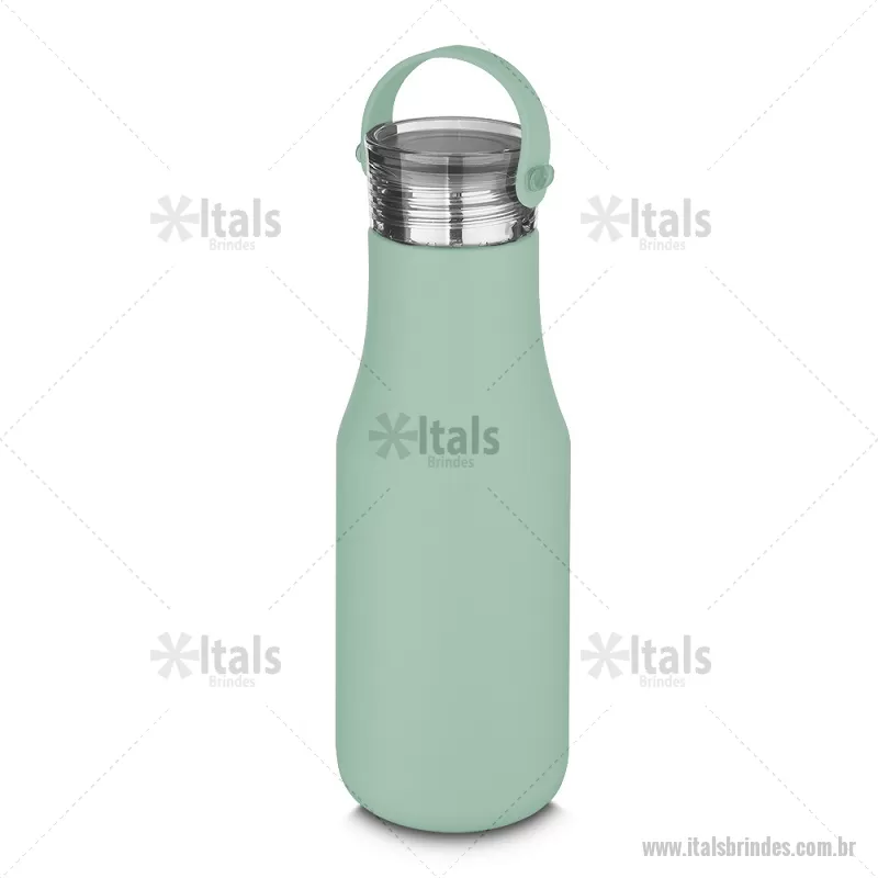Garrafa térmica em aço inox com parede dupla com capacidade de até 500 ml. Tampa plástica rosqueável, alça em silicone e anel de silicone para vedação.