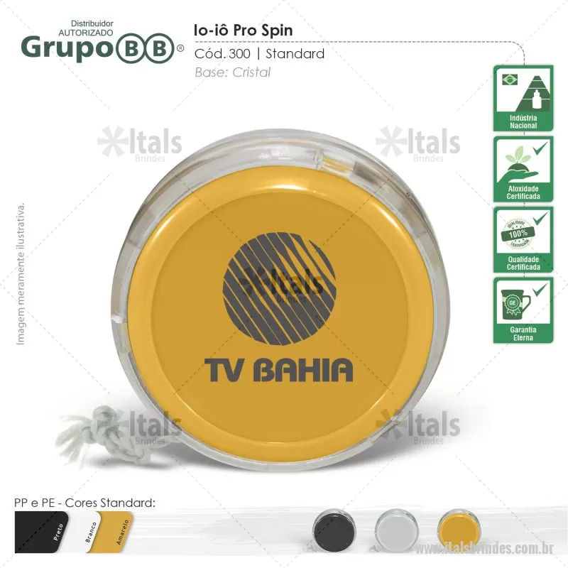 Io-iô PRÓ SPIN personalizado de alta performance base Maciça fixada por ultrassom em PS cristal com laterais acopladas em PP. Cordão duplo em algodão trançado. CORDÃO - NATURAL (CRU) / PARTE INTERNA - CRISTAL: Transparente, verde, vermelho, azul, lilás / NEON CRISTAL: rosa neon, verde neon, amarelo neon, alaranjado neon. PARTE EXTERNA - Linha Sólida: amarelo, branco, alaranjado, preto / Neon: Rosa, amarelo, verde, laranja / Metalizado: Azul, verde, vermelho, lilás, prata. Ótimo brinde para ações promocionais. Personalização 1 cor. Outras opções sob consulta. Distribuidor Autorizado Grupo BB. - - ITAZ300