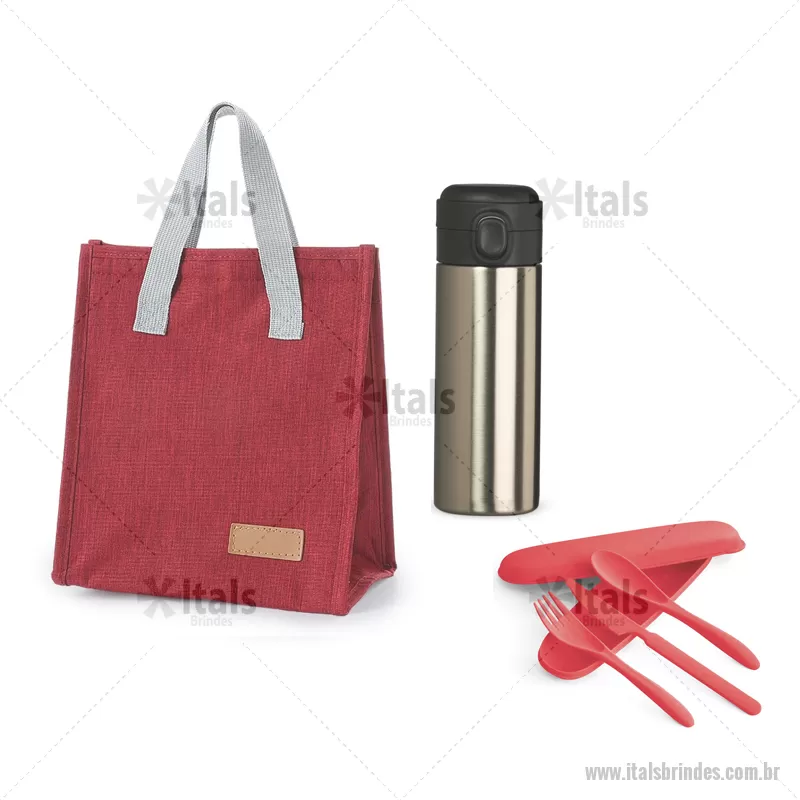 Kit térmico 3 peças Contém: 1 Bolsa Térmica Estilo Sacola Oxford com capacidade de 5 litros com fechamento em velcro. Contém alças de mãos e plaquinha personalizável fixa. Dimensão: 22,0 cm x 17,0 cm x 14,0 cm (BT060) 1 Garrafa térmica em inox com parede dupla, capacidade de 400ml. Tampa com botão central para abertura e borracha interna para vedação. Dimensão: 7,6 cm x 20,3 cm (GAT121) 1 Conjunto de 3 talheres em fibra de bambu (50%) e PP (50%) com garfo, faca e colher. Incluso estojo. Food grade. Medidas produto: 20,5 x 6,5 x 2,5 cm - - ITAKIT028