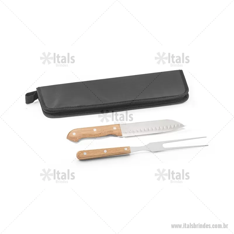 Kit churrasco com estojo em 210D. Composto por 2 utensílios em aço inox com cabos em madeira: garfo e faca japonesa. Certificação EU Food Grade. A cor e o resultado da impressão nos materiais naturais pode variar entre produtos. Garfo: 300 mm | Faca Japonesa: 285 mm | Dimensão da mala: 350x130x20mm - - ITAKCH092