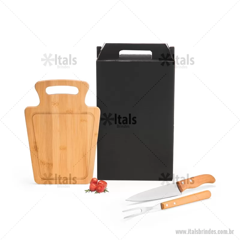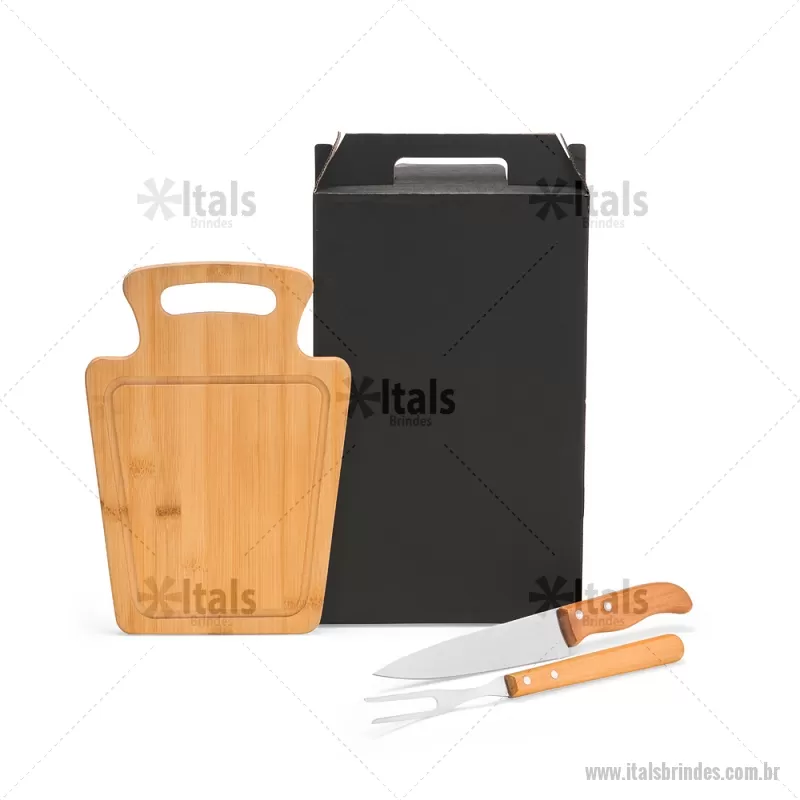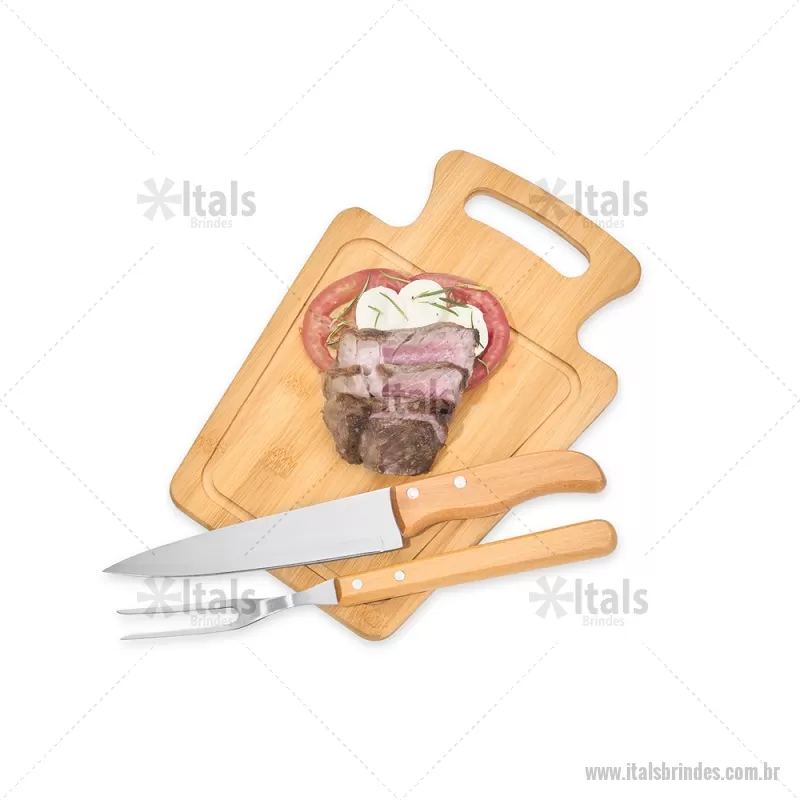 Conjunto Para Churrasco Em Bambu / Madeira / Inox - 3 Pçs Composto por tábua em Bambu com 30x21x1,2 cm; faca 7'' e garfo em Madeira/Inox. Dimensões do Produto Tábua: 30x21x1,3 cm Sugestão de Personalização Uma gravação a Laser na petisqueira e lâmina da faca; uma gravação em Silk/Digital na caixa. Embalagem : Caixa Preta 40x21,8x4,5 cm (AxLxP) Peso: 619 g (com embalagem) - - ITAKCH095