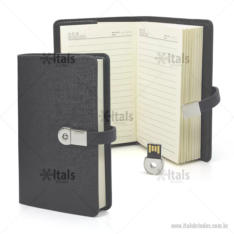Kit Escritório - Agenda com Pen Drive Removível. Item ideal para trabalhos e reuniões. Agenda confeccionada em couro sintético, possui folhas pautadas e fechamento especial com Pen Drive secreto, podendo ter 4GB ou 8GB. Gravação em Laser. - - ITAKES001