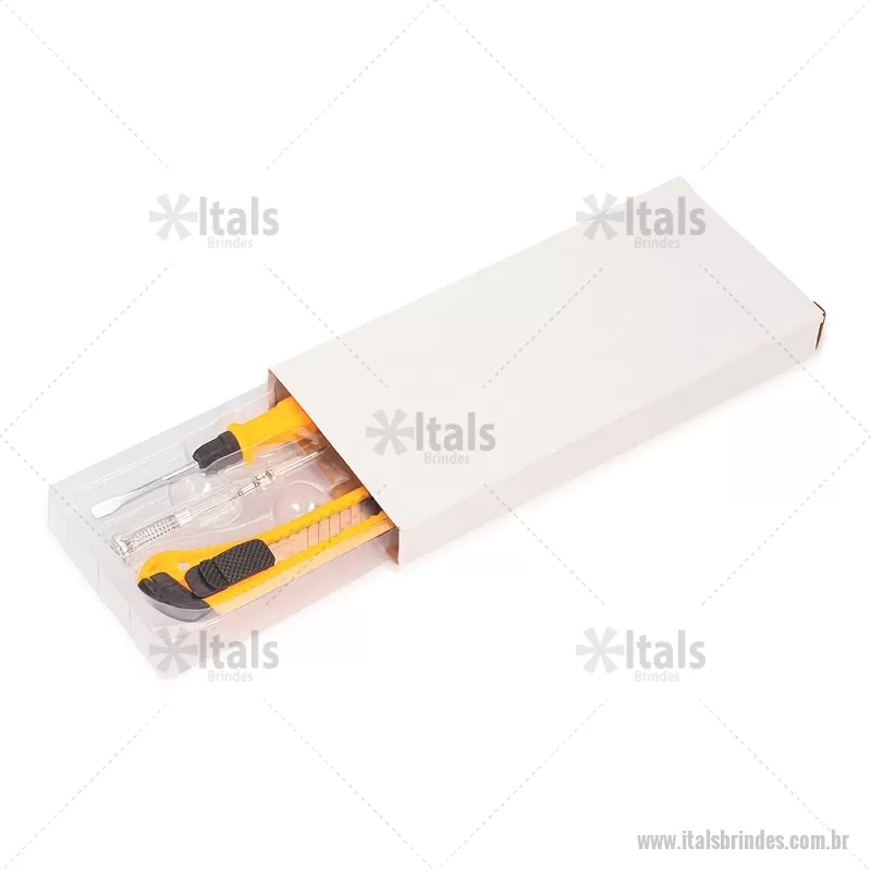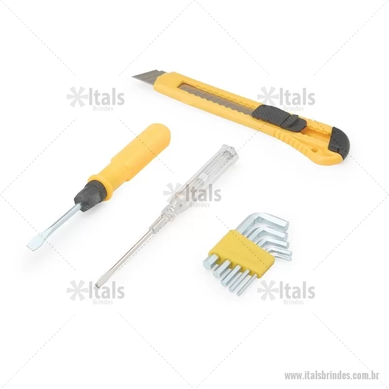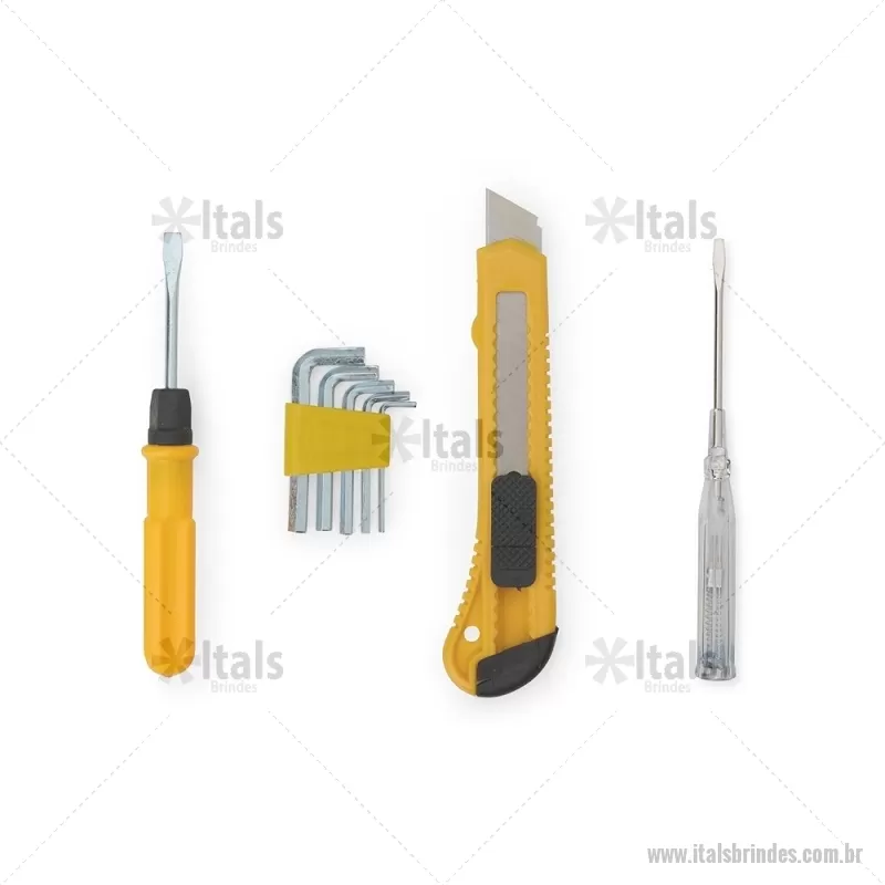 Kit de ferramentas compacto e funcional, ideal para pequenos reparos do dia a dia. Inclui estilete, chave de fenda teste, jogo de chaves Allen com 5 medidas e chave dupla com pontas fenda e Phillips. Produzido com acabamento em plástico resistente, oferece durabilidade e praticidade para resolver imprevistos com facilidade. - - ITAFER067