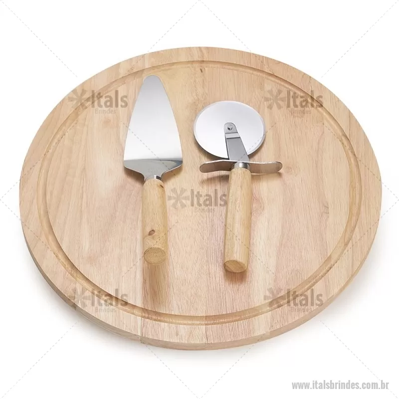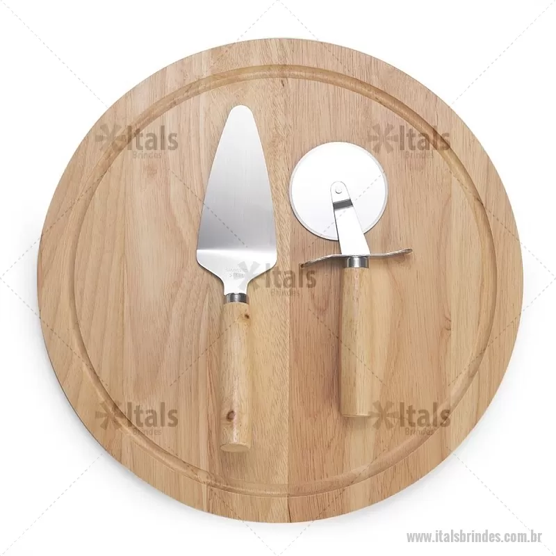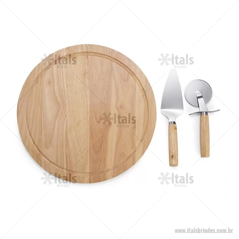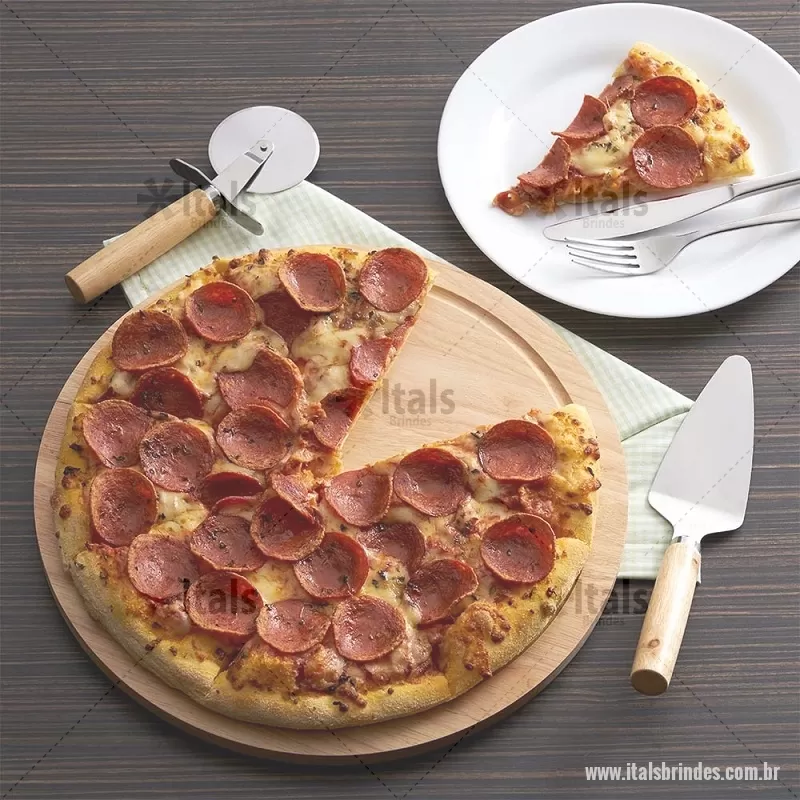 Kit pizza 3 peças, contém: tabua de bambu com canaleta, espátula de inox com cabo de bambu e cortador de pizza de inox com cabo de bambu. Altura : 32,4 cm x Largura : 32,4 cm x Espessura : 1,3 cm Peso aproximado (g): 887 Gravação em Laser. - - ITAKPZ004