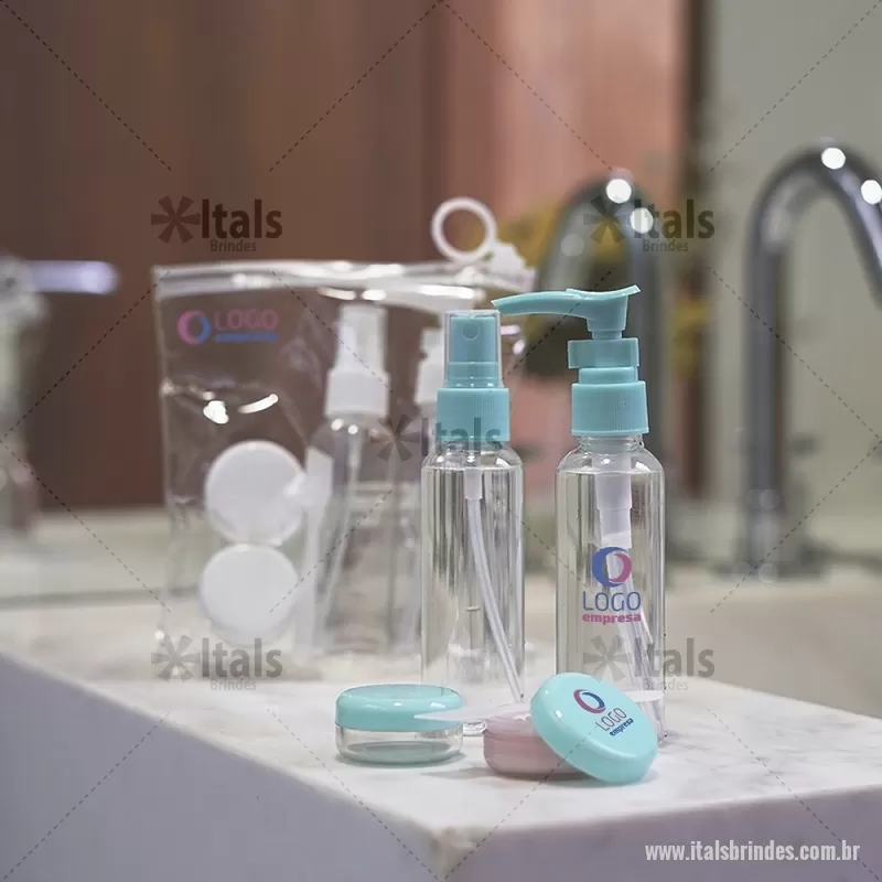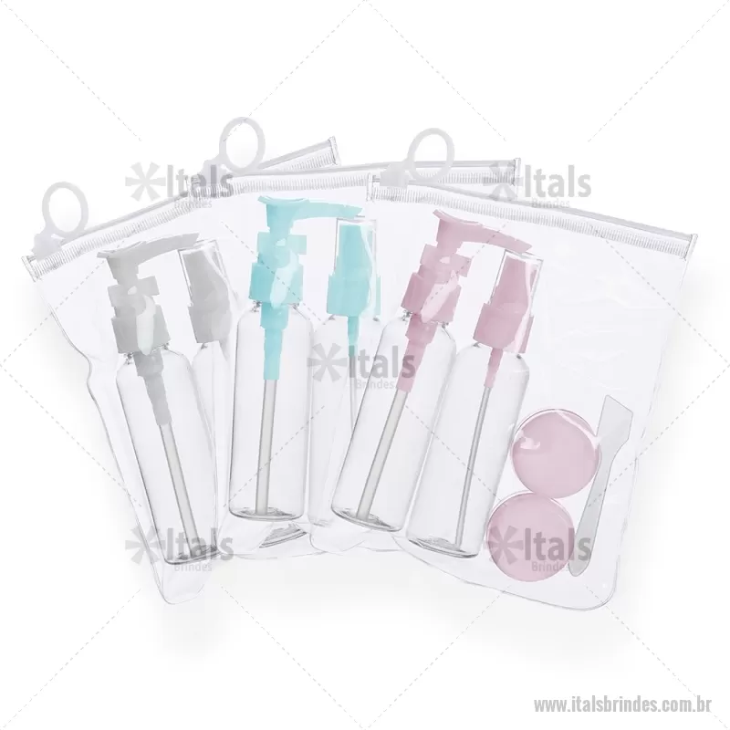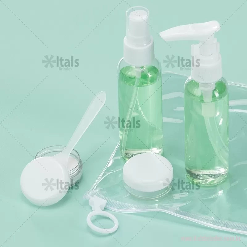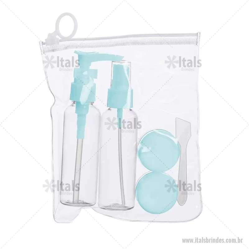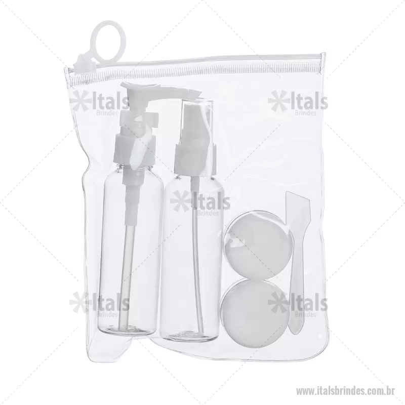 Kit Viagem 5 Peças Descrição: Kit viagem 5 peças em estojo ziplock. Contém frasco de 70ml com tampa spray; frasco de 70 ml com tampa pump; 2 potes de 10ml com tampa rosqueável e mini espátula fosca. Frascos plásticos e estojo em pvc com puxador plástico. Altura : 17,2 cm x Largura : 14,5 cm Peso aproximado (g): 61 - - ITAKVG017