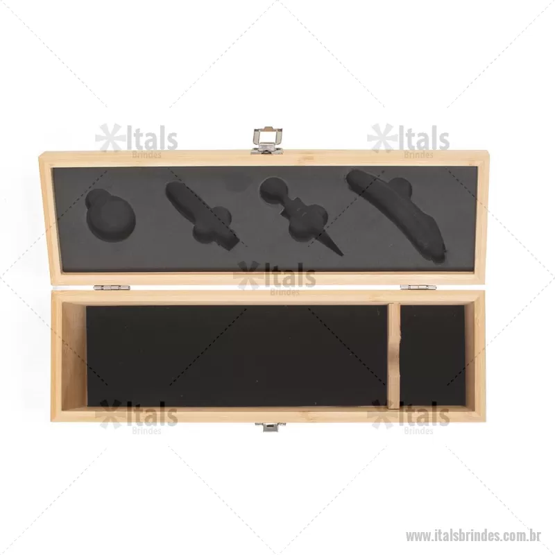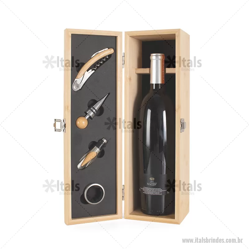 Kit Vinho em bambu com interior em EVA e fecho em inox, suporte para garrafa de vinho de 750 ml (padrão). Contém: saca-rolha de metal com detalhes em bambu e cortador de lacre, anel corta-gotas de metal, bico para servir de metal com tampa em bambu e tampa de metal com detalhe em bambu. Peso do Produto: 0,997kg Dimensão do Produto: 11x36x11cm *Não acompanha garrafa vinho, imagem meramente ilustrativa. - - ITAKVI051