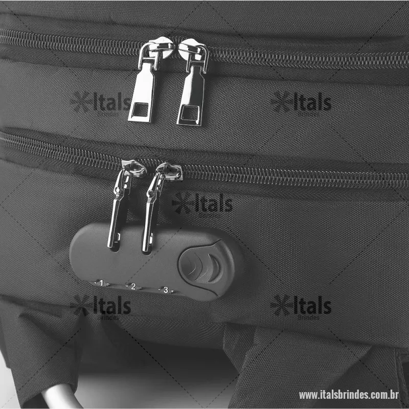 Uma mochila moderna com bastante espaço interno incluindo porta notebook, possui fechamento em cadeado com segredo. Alça de mão em metal, fita reflexiva, um bolso frontal grande. Divisórias internas para canetas, documentos e telefone celular. Alça almofadada. Saída USB e fone de ouvido. Tecido em poliéster. Esta é a melhor escolha para surpreender seus clientes, parceiros ou funcionários. - - ITAMC118