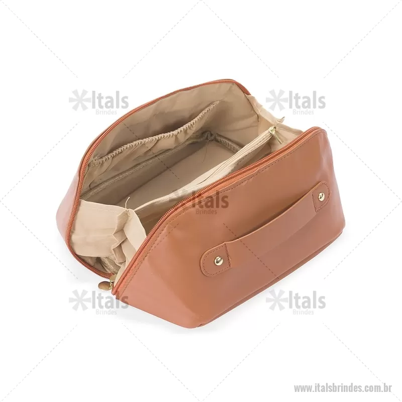 Nécessaire em PU impermeável com abertura em 180 graus, estilo concha, oferecendo fácil visualização dos itens. Possui compartimento interno amplo com dois bolsos laterais e um bolso central com zíper, além de alça para transporte. Ideal para organizar acessórios e produtos pessoais. - - ITANC146