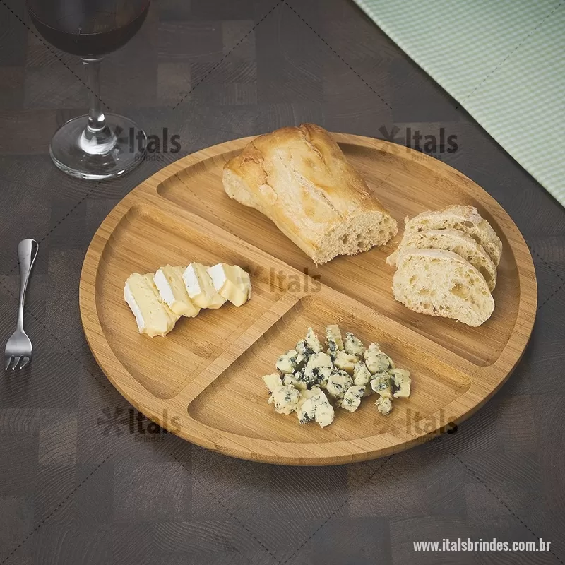 Petisqueira de bambu grande com 3 divisórias. Medidas: Largura : 30 cm x Espessura : 1,6 cm x Comprimento : 30 cm Peso aproximado (g): 518 Ideal para todos os tipos de petiscos, queijos, frios, pães e etc. - - ITACOZ020