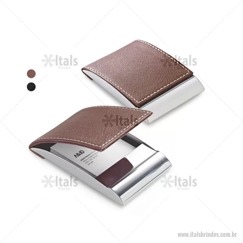 Porta cartão em couro sintético com detalhe em metal. Brindes exclusivos personalizado em laser, fornecido em caixa 6,3 x 9,7 x 1,4 cm. - - ITAPCA016