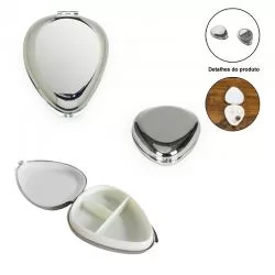 Porta comprimido personalizado de metal com 3 divisórias. Parte superior com área central oval fosca e verso espelhado. Parte interna plástica com três divisões. - - ITAPCP007
