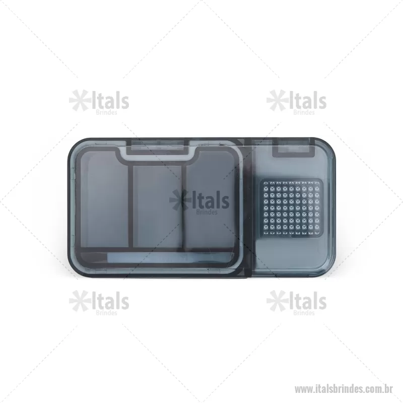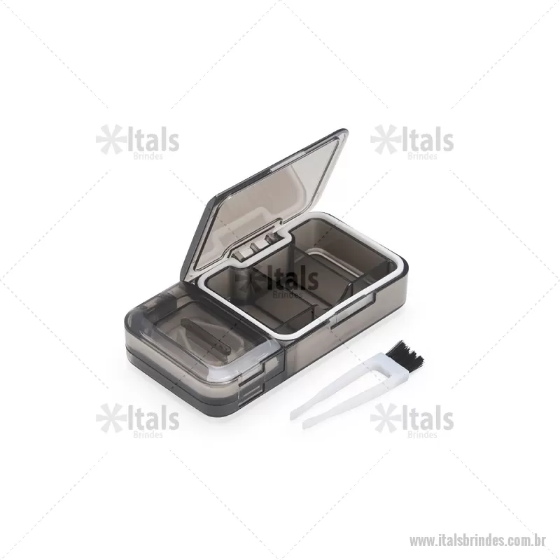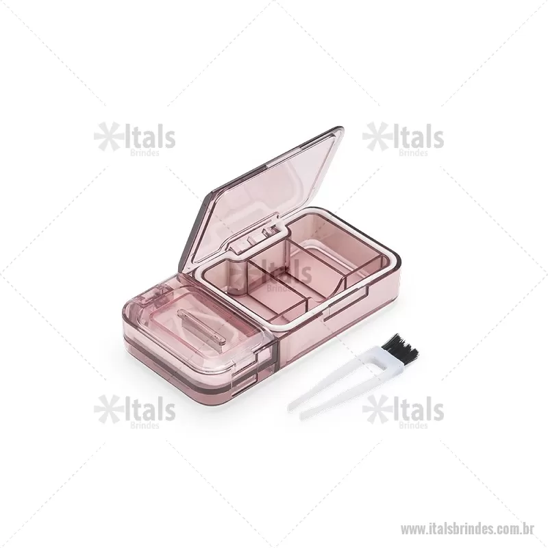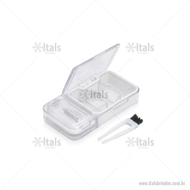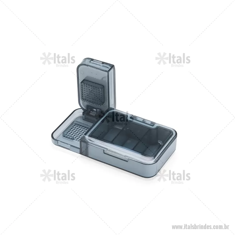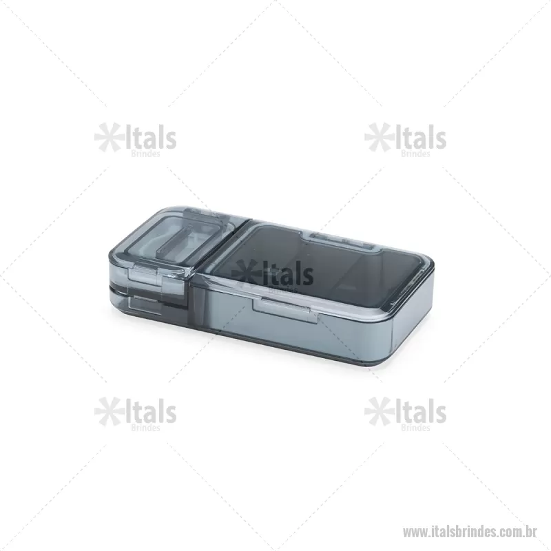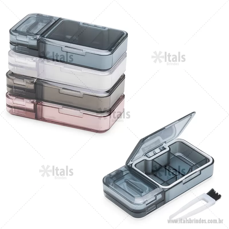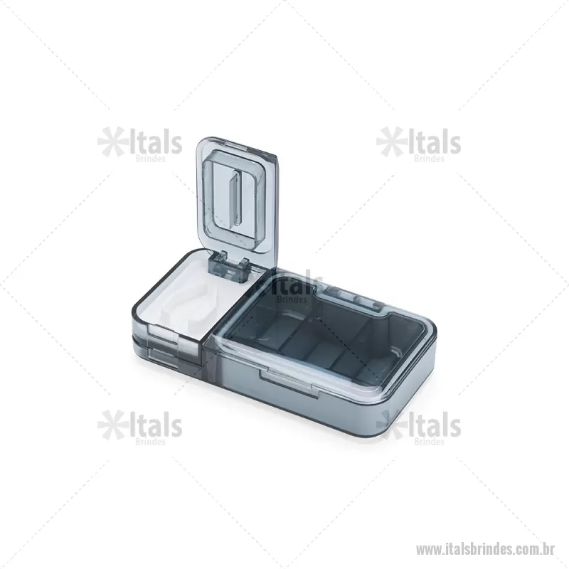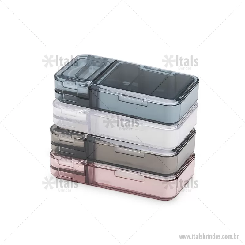 Porta Comprimidos Plástico Descrição: Porta-comprimidos multifuncional em plástico. Possui três divisórias com capacidade de até 10ml cada, além de dois compartimentos especiais: um cortador de comprimidos na parte superior e outro para trituração, localizado na parte inferior. Largura : 6 cm x Espessura : 2,5 cm x Comprimento : 12 cm Peso aproximado (g): 107 - - ITAPCP017