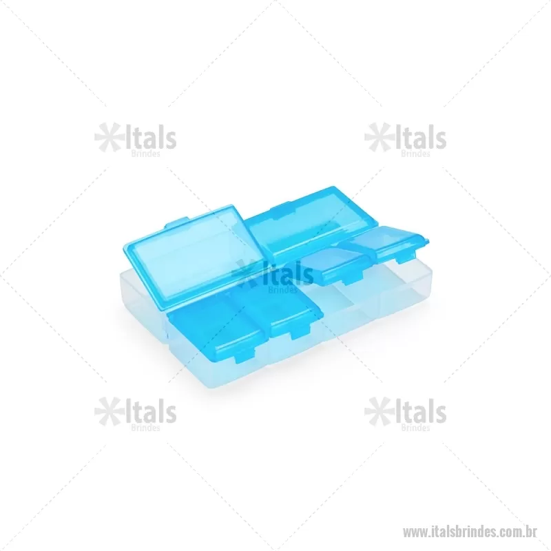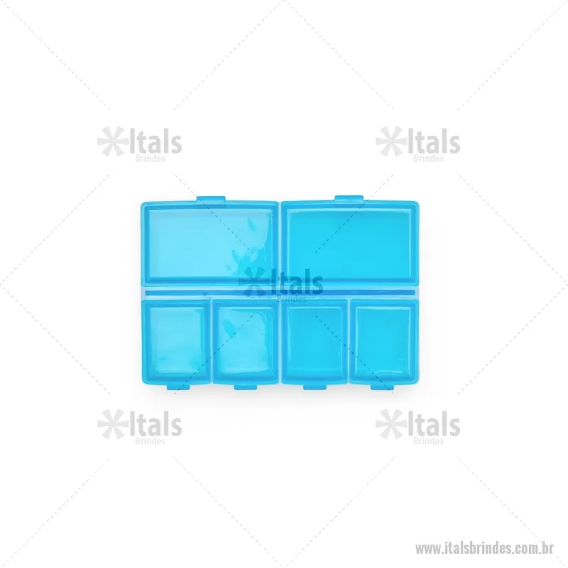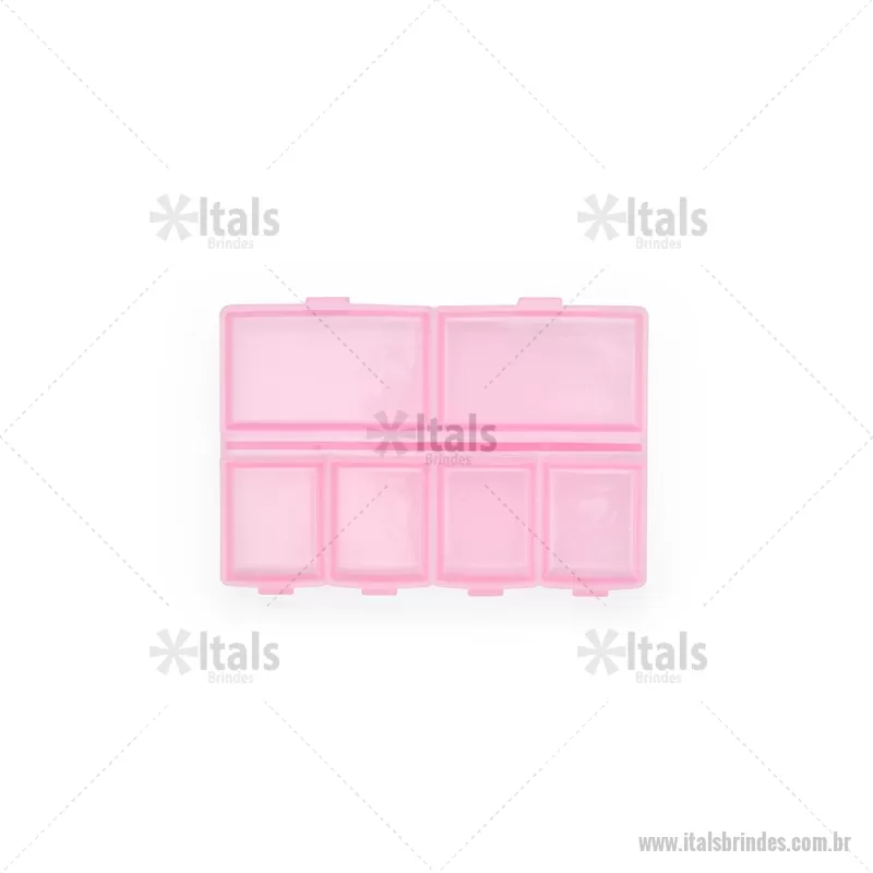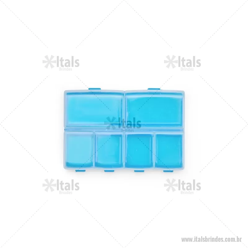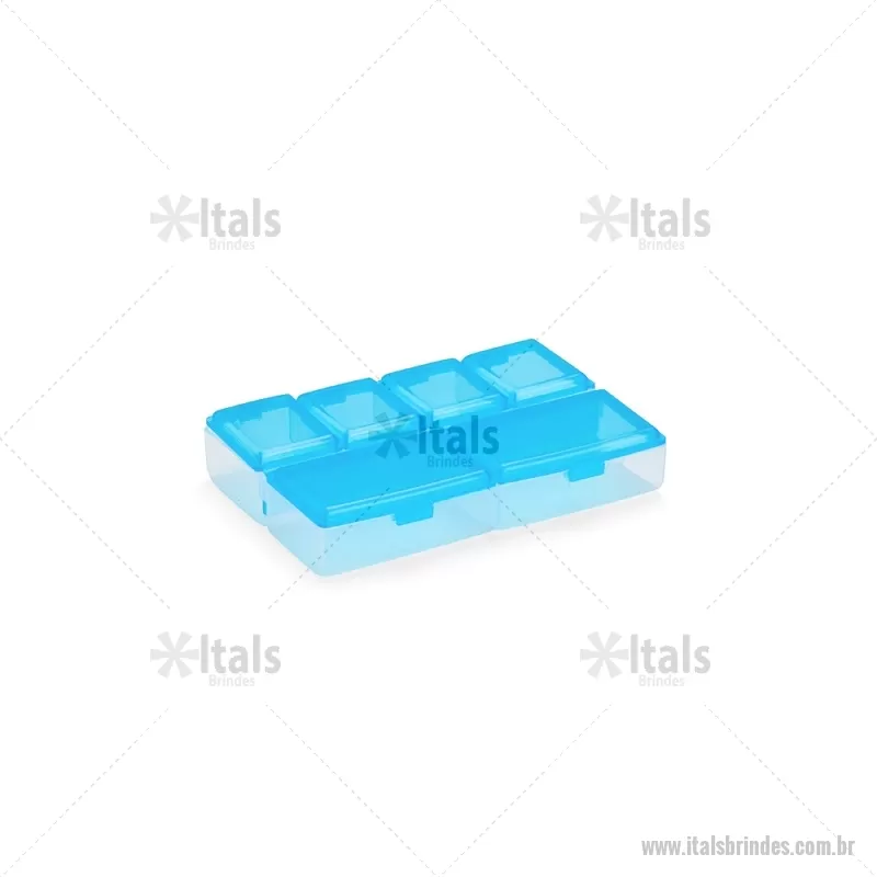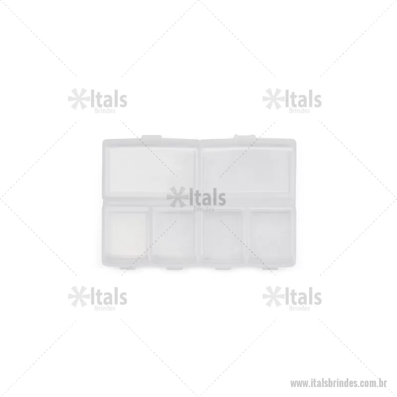 Porta-Comprimidos Plástico Descrição: Porta-comprimidos em plástico com seis compartimentos, dois maiores e outros quatro menores, oferecendo mais possibilidades de organização. Largura : 6,4 cm x Espessura : 1,9 cm x Comprimento : 9,5 cm Peso aproximado (g): 23 - - ITAPCP015