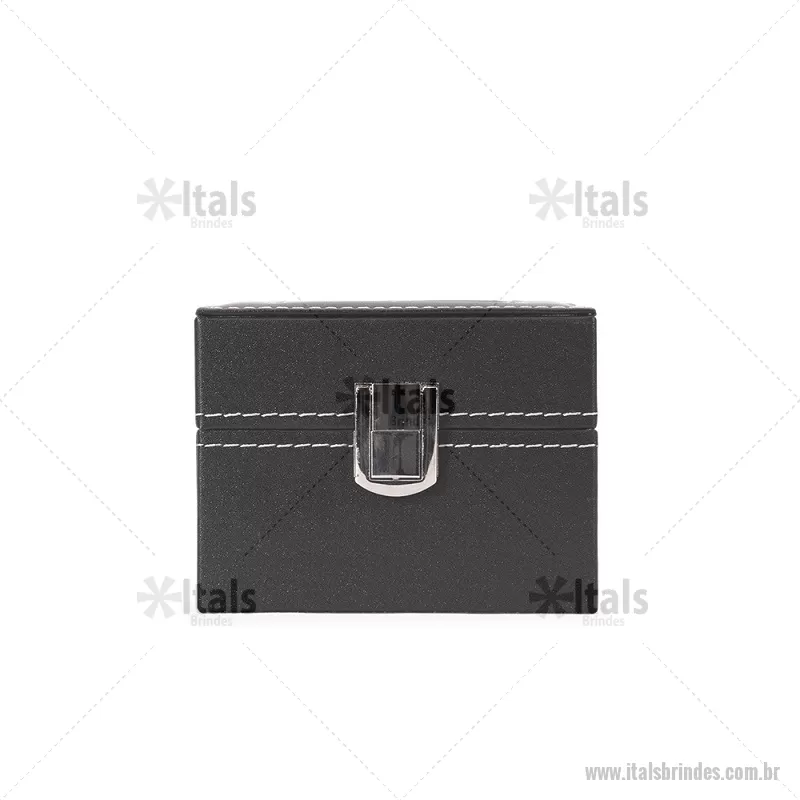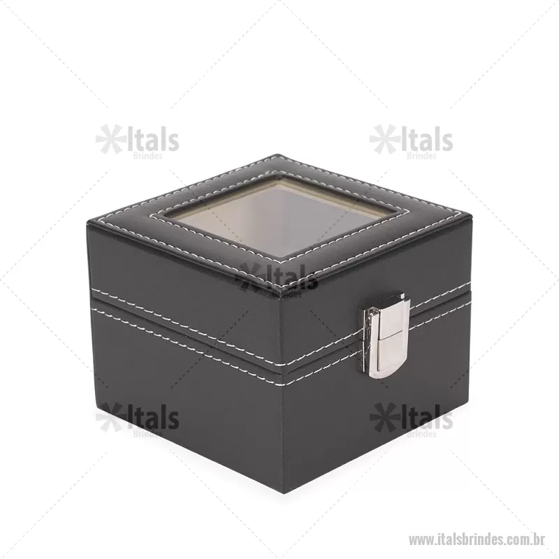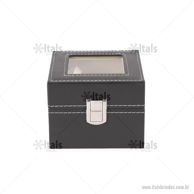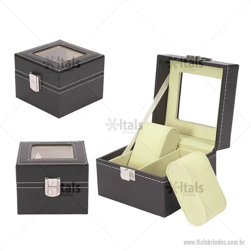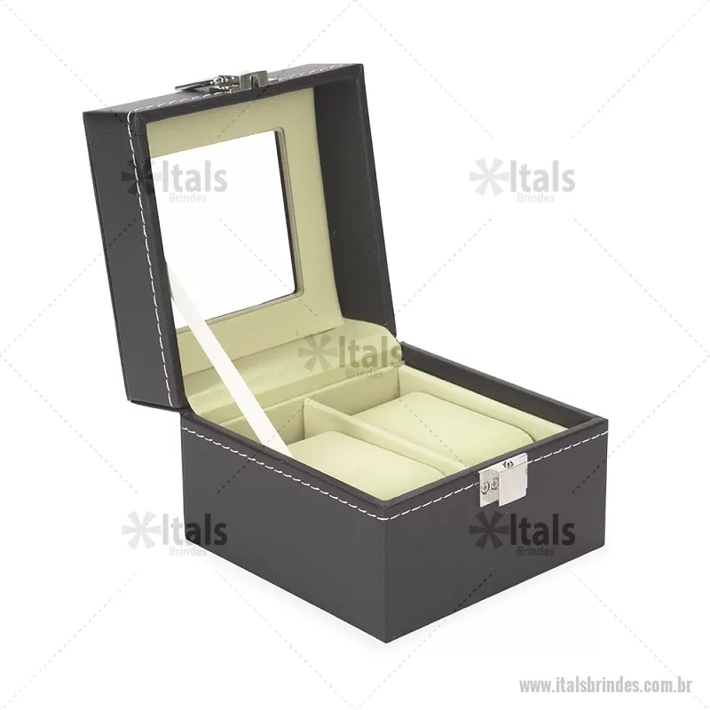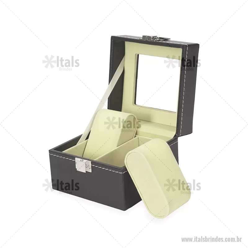 Porta relógios com acabamento externo em couro sintético à base de PVC e interior revestido em veludo macio. Possui duas divisórias com almofadas removíveis para melhor acomodação das peças, tampa com visor em vidro que facilita a visualização e trava de segurança que garante o fechamento adequado do estojo. Ideal para organizar e proteger relógios com elegância. - - ITAPREL001