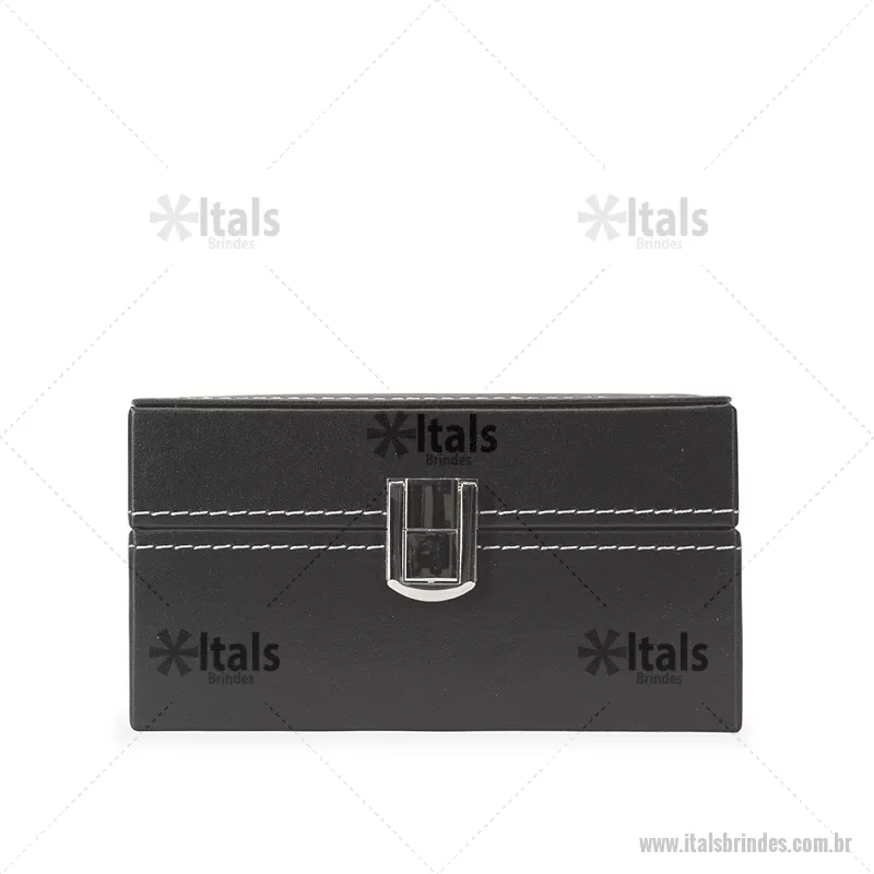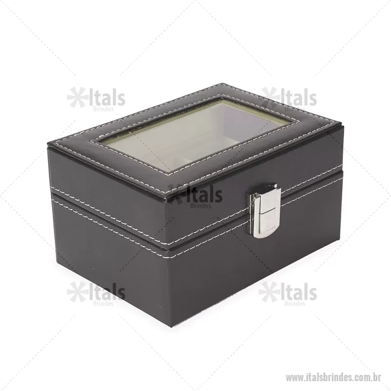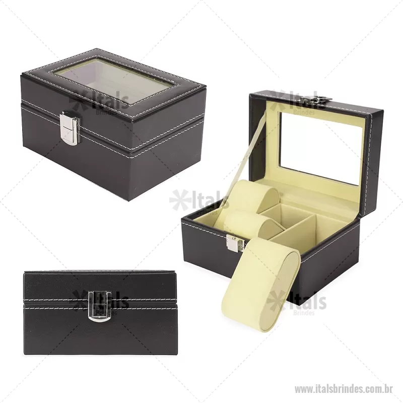 Estojo porta relógios com acabamento externo em couro sintético à base de PVC e interior revestido em veludo macio. Possui duas divisórias com almofadas removíveis para acomodar os relógios, tampa com visor de vidro e fecho com trava de segurança, garantindo proteção e organização com elegância. - - ITAPREL002