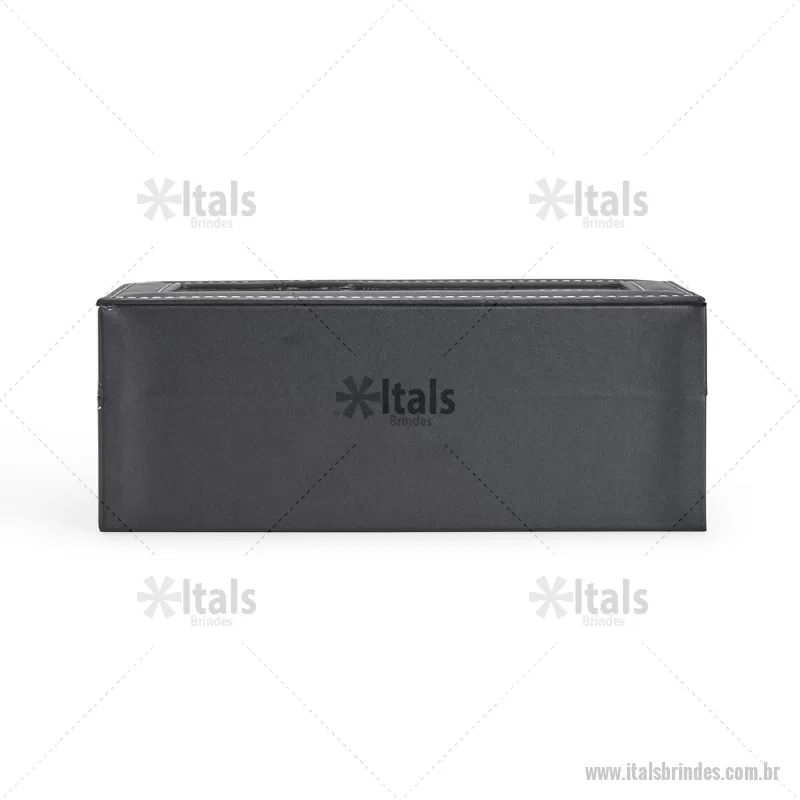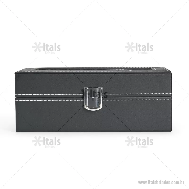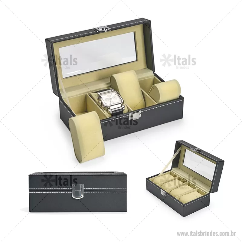 Porta-relógios com acabamento em couro sintético em PVC e interior forrado em veludo. Possui quatro compartimentos com almofadas de espuma removíveis, visor superior em vidro e trava de segurança, ideal para organizar e proteger relógios com elegância. - - ITAPREL003