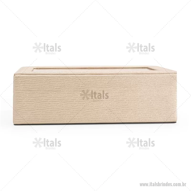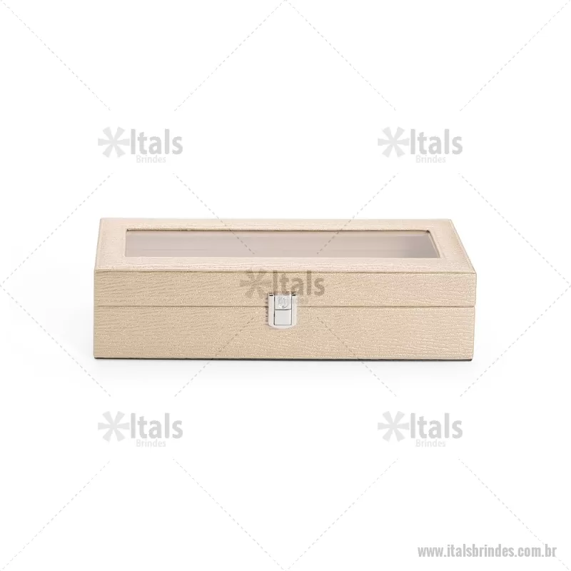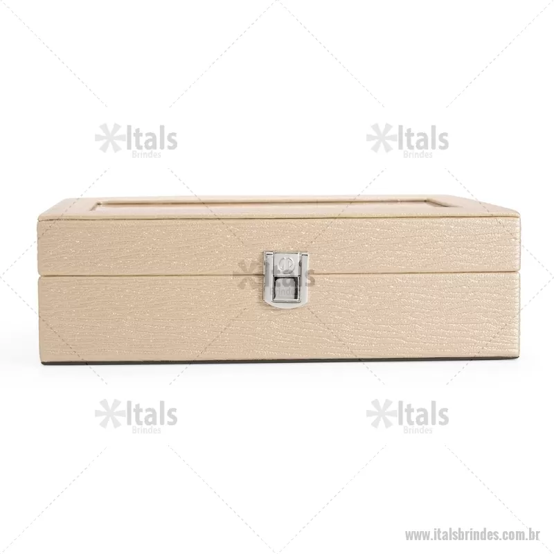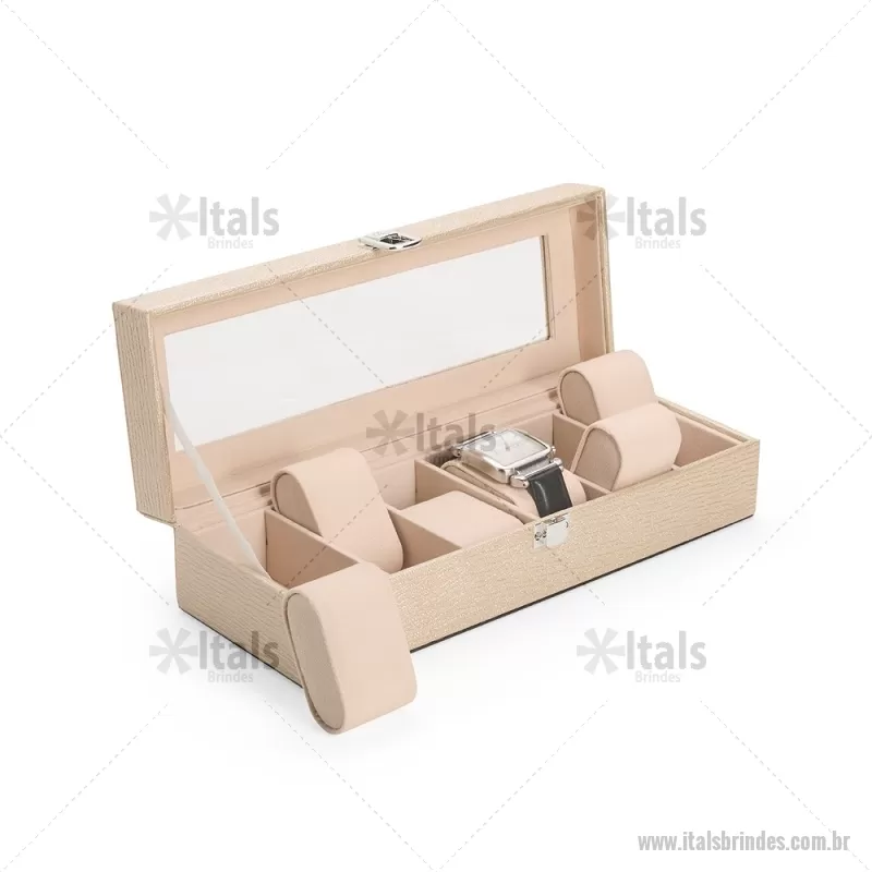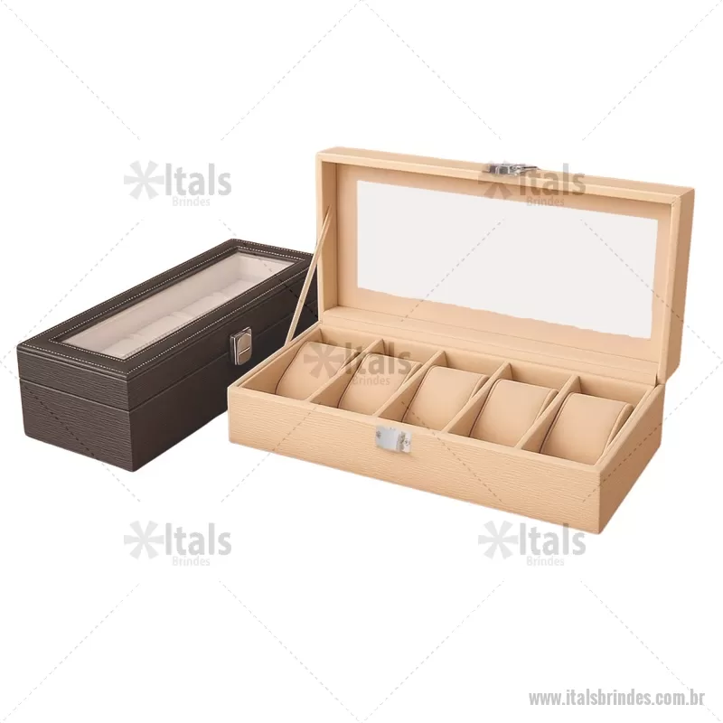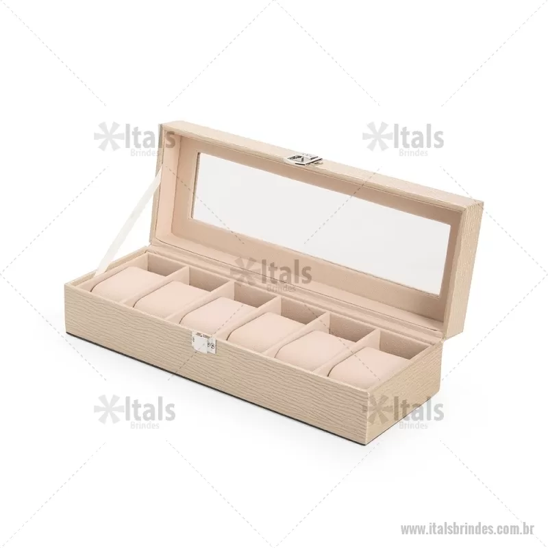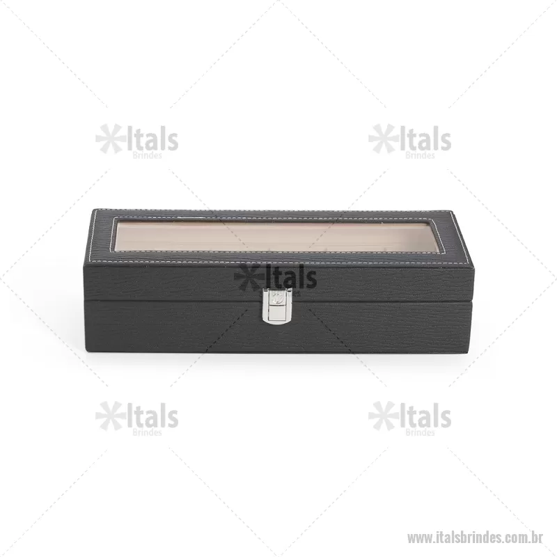 Porta-relógios com acabamento em couro sintético texturizado à base de PVC e interior revestido em tecido aveludado. Possui seis compartimentos com almofadas removíveis, visor em vidro transparente e trava de segurança, ideal para organizar e proteger relógios com elegância. - - ITAPREL004