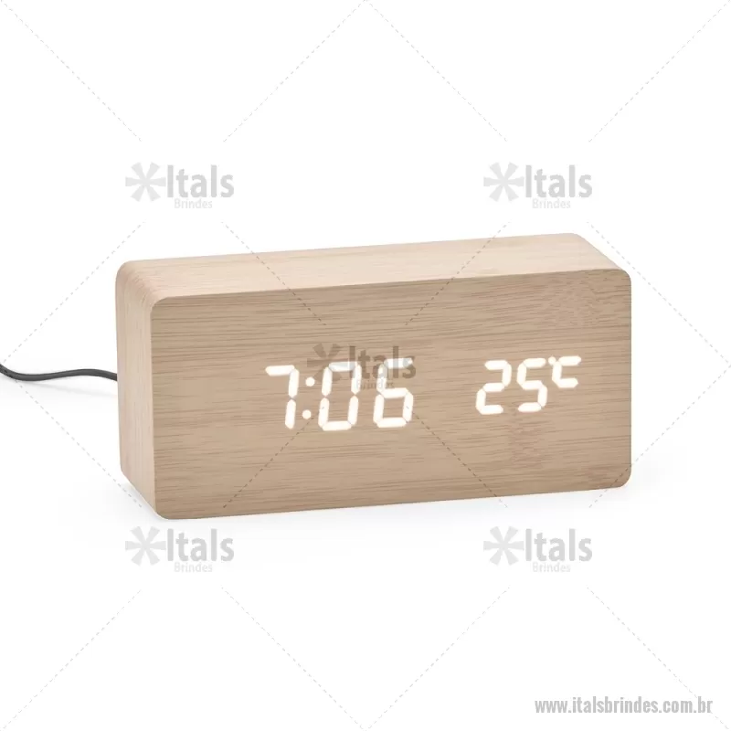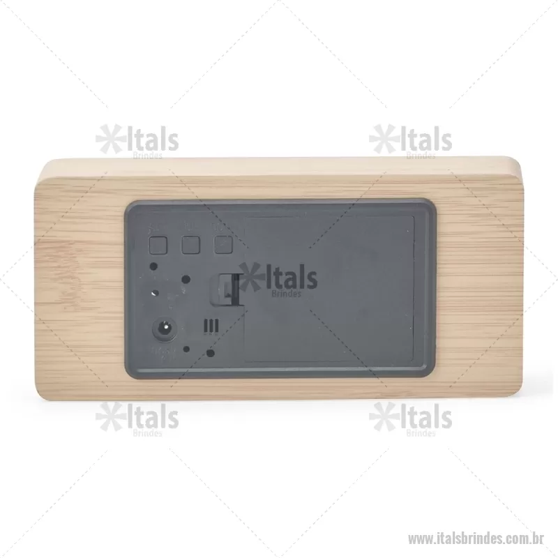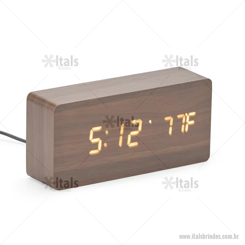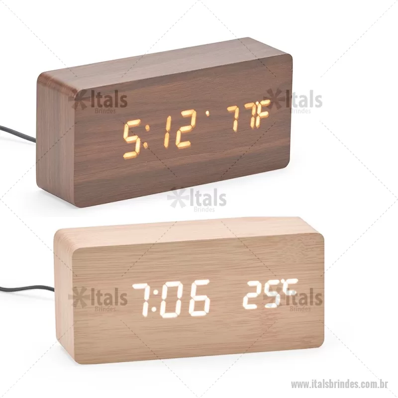 Relógio despertador em madeira com display LED, que combina design elegante e tecnologia moderna. Exibe horas, data e temperatura ambiente, além de permitir a programação de até três alarmes com diferentes configurações. Pode ser alimentado por 4 pilhas AAA (não inclusas) ou por cabo USB DC 5V, que acompanha o produto, oferecendo praticidade para o uso diário. - - ITAREL023