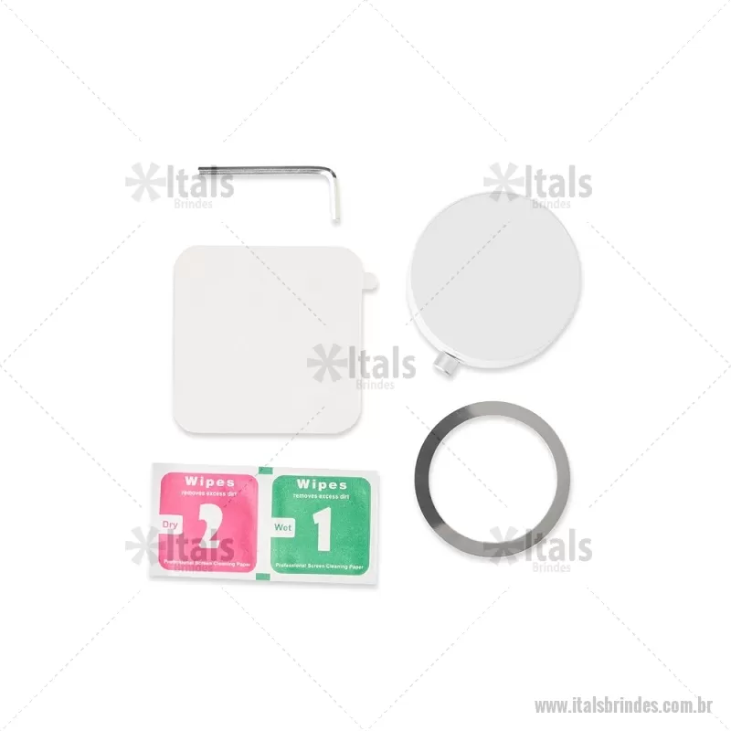 Suporte magnético para smartphones feito em plástico, com ajuste de inclinação e ventosa retrátil acionada por chave seletora para fixação em superfícies lisas. Permite uso do aparelho na vertical ou horizontal por meio do encaixe magnético, compatível com celulares com função magnética ou com anel adaptador. Acompanha dois anéis magnéticos adesivos, um adesivo em policarbonato, kit de limpeza e chave Allen. - - ITATEC536
