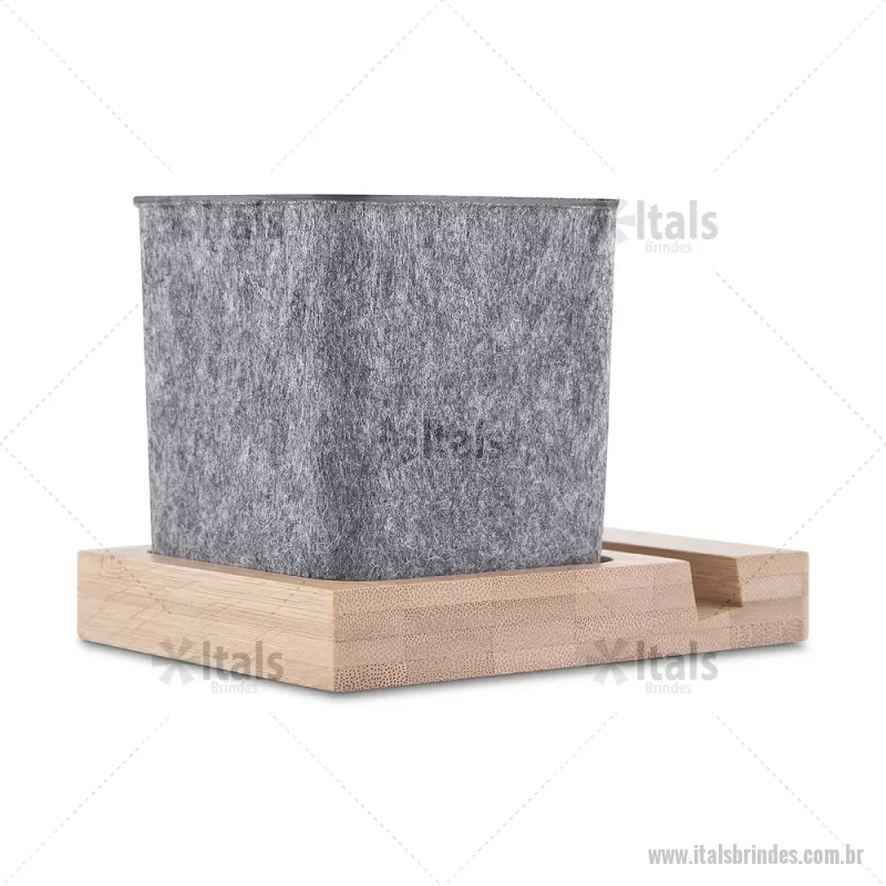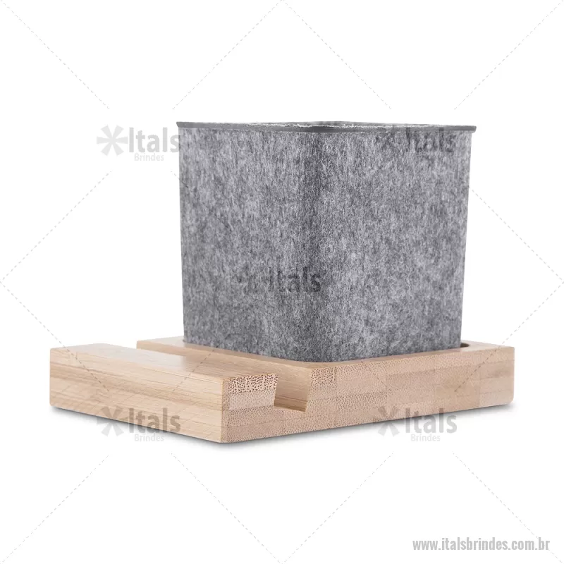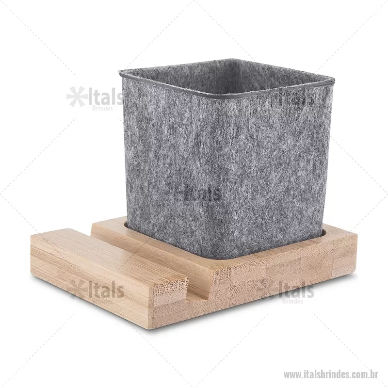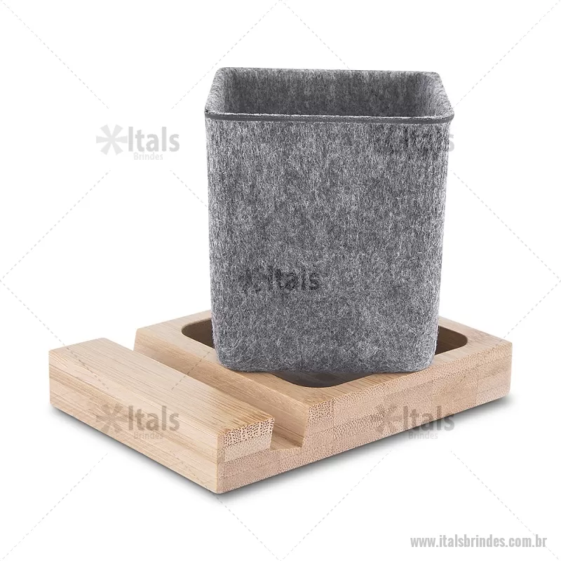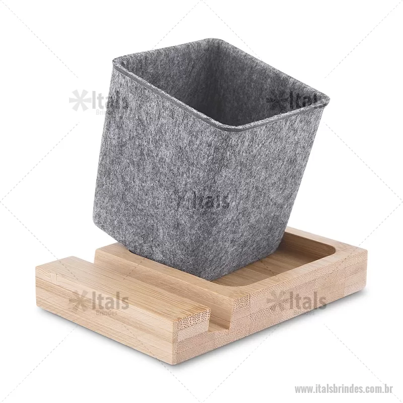 Porta objetos/smartphone em feltro e bambu Porta-objetos em feltro reciclado com suporte para celular em bambu. Prático e versátil, ideal para organizar canetas, lápis, marcadores e manter a mesa de escritório sempre funcional e elegante. Peso do Produto: 0,112kg Dimensão do Produto: (1,7x11,7x8,5cm) (Base em bambú) Dimensão do Produto: 8x6,5x6,5cm (Porta Caneta) - - ITAPC021